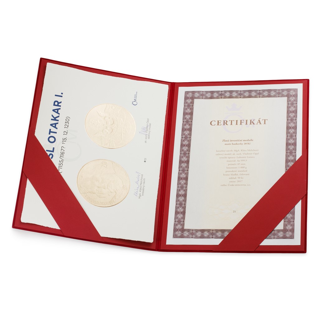 Medaile vyražené z jednoho kilogramu ryzího zlata, jejichž reliéf vychází z mistrovských bankovek vytvořených Oldřichem Kulhánkem, byly po dlouhá léta vlajkovou lodí České mincovny. V roce 2017 se tato kapitola uzavírá, neboť zbylo poslední papírové platidlo, kterým se můžeme inspirovat – dvacetikoruna s portrétem Přemysla Otakara I.