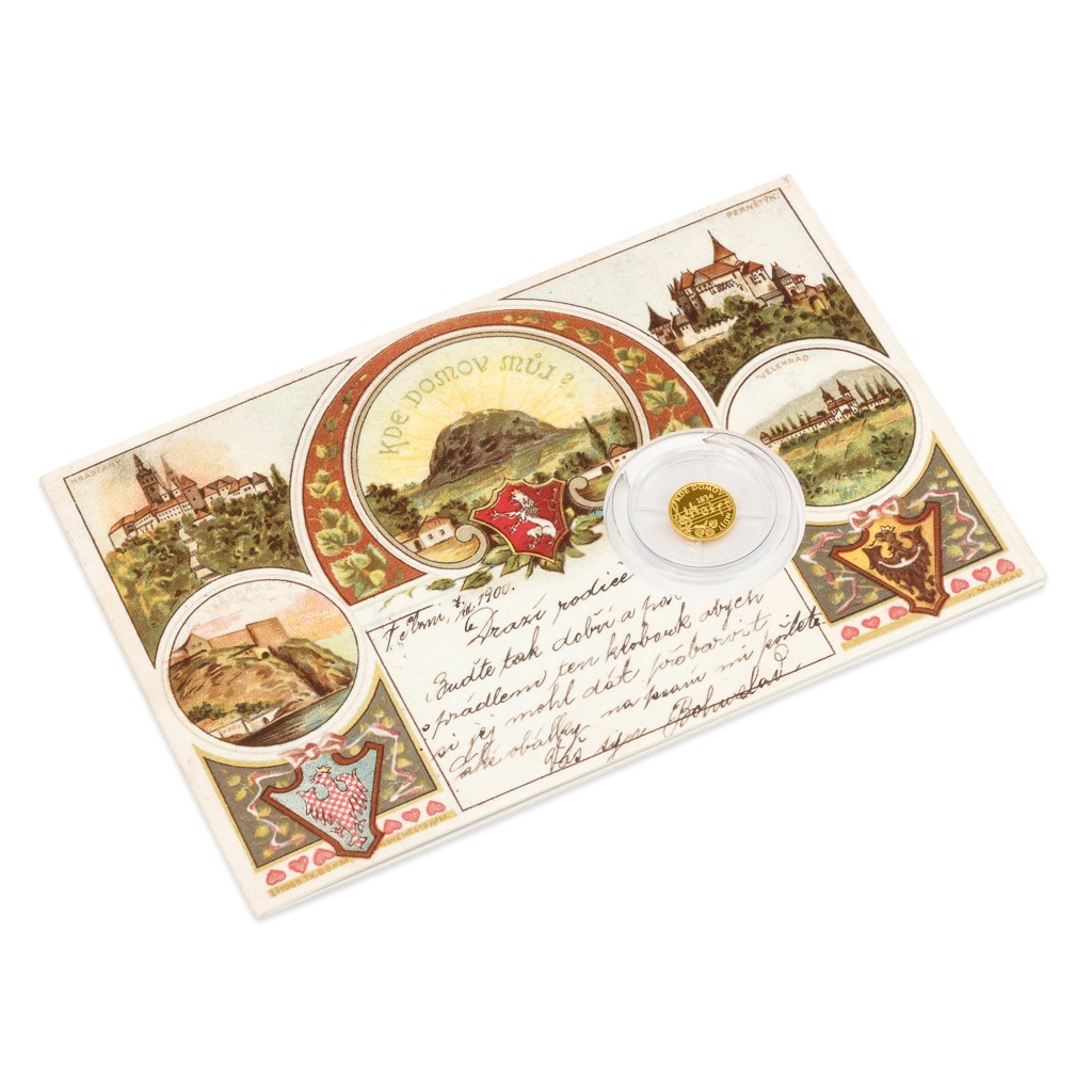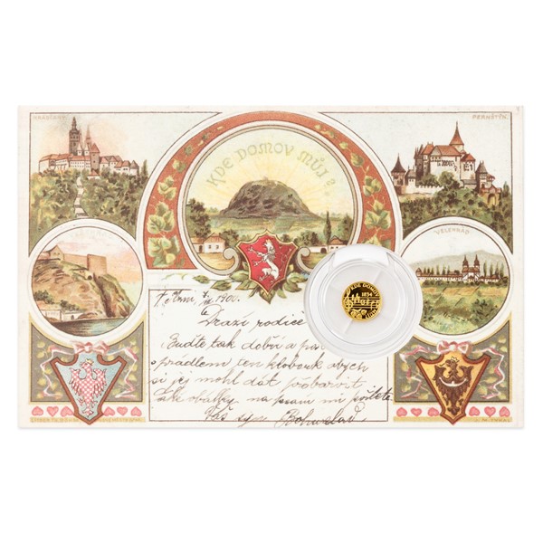 Řada pamětních mincí vyražených z jedné poloviny gramu ryzího zlata, které jsou zasazeny do replik dobových pohlednic, byla zahájena teprve nedávno, ale již se zařadila mezi oblíbené stálice České mincovny. V roce 2019 se v pohlednici namísto zlaté minimince objevuje výjimečně zlatá minimedaile. Jejím tématem je divadelní hra Fidlovačka aneb Žádný hněv a žádná rvačka, která byla uvedena před 185 lety a ve které poprvé zazněla budoucí česká hymna.