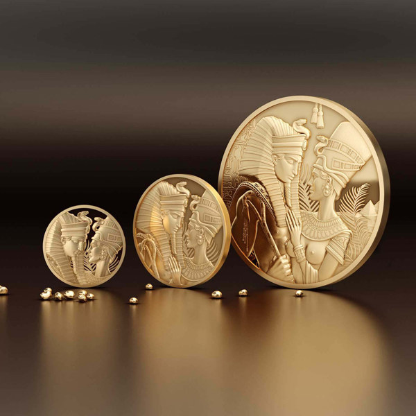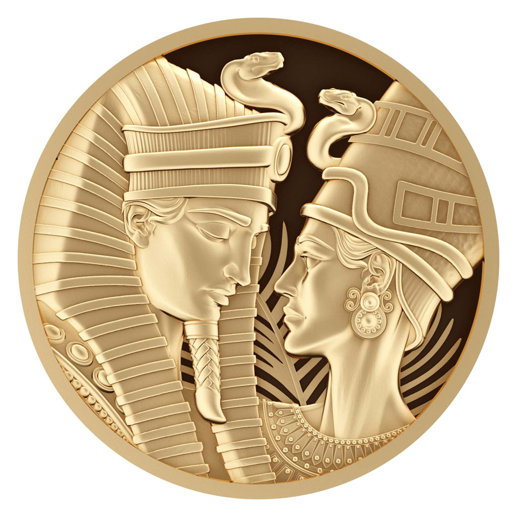 Zlatá mince s hmotností jedné desetiny trojské unce a s motivem legendárního panovnického páru Amenhotepa a Nefertiti představuje výtvarný unikát i sběratelskou raritu.