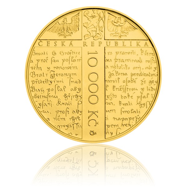 Averzu 10 000Kč mince z ryzího zlata vévodí rukopis Mistra Jana Husa s velkým křížem, jehož plocha poskytla prostor pro vkusné umístění nominálu 10 000 Kč a nápisu ČESKÁ REPUBLIKA. V horní části kompozice se pak nacházejí ještě tři české zemské znaky. Reverzní strana překvapuje odvážným, graficky čistým pojetím, jemuž dominuje charismatická figurální plastika Jana Husa doplněná nápisy MISTR JAN HUS a letopočty 1415–2015. Originální umělecké dílo dává tušit významný investiční potenciál – uložte si své finanční rezervy bezpečně a radujte se z nového pokladu v numismatické sbírce!