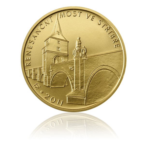 Počínaje rokem 2011 začala Česká národní banka emitovat zlaté pamětní mince s nominální hodnotou 5000 Kč v novém cyklu, jehož tématem jsou mosty České republiky. Zatímco první z nich byla věnována gotickému mostu v Písku, druhá mince zobrazuje renesanční most ve Stříbře. Stejně jako v prvním případě byl její výtvarný návrh vybrán v celostátní anonymní soutěži. Autorem vítězného návrhu se stal sochař Zbyněk Fojtů díky vyvážené kompozici obou stran, dokonalému vystižení stříbrského mostu a nápaditému použití charakteristických sgrafit a znaku z mostní brány. Všechny mince cyklu „Mosty České republiky“ jsou vyrobeny ze zlata o ryzosti 999,9, váží 15,55 g a jejich průměr činí 28 mm. Mince se vydávají ve dvojím provedení ražby – ve standardní kvalitě, kde je celá plocha mince stejně leštěna, a ve špičkové kvalitě s leštěným mincovním polem a matovaným reliéfem. V bohatém horním městě Stříbře se těžilo stříbro a olovo, jeho důkladné opevnění odpovídalo zámožnosti i strategické důležitosti města. Z hradeb se vycházelo na renesanční dvouobloukový kamenný most, dále pod branskou věží na tříobloukový záplavový most. Mosty nejsou souosé a parapetem dvouobloukového mostu prochází odvodňovací korýtko. Světlost obou oblouků přes řeku Mži je odlišná, most je široký necelých šest metrů, avšak celková délka obou mostů činí 60 m. Samotná brána stojí na 5,15 m širokém návodním pilíři, věž má čtvercový půdorys s přístavkem pro spirálovité schodiště, obdélná okénka a kamenný reliéf s dobovým českým nápisem. Na věži, zakončené originální šestibokou jehlancovou stanovou střechou krytou prejzy, jsou zbytky renesančního sgrafita. Na mostě se nachází barokní socha sv. Jana Nepomuckého – patrona mostů. Patro věže zpřístupňuje boční schodiště vysunuté na krakorcích. Most byl postaven v letech 1555–1560 a až do roku 2000 sloužil i automobilové dopravě. Na lícové straně je znázorněn detail sgrafitové výzdoby s reliéfem městského znaku (za raritu může být považován stranově otočený český lev). V obdélníku nad reliéfem je místo českého renesančního nápisu umístěn text: ČESKÁ REPUBLIKA , MOSTY, 5000 Kč. Nad reliéfem vidíme heraldická zvířata – českého lva, moravskou a slezskou orlici, pod městským znakem pak značku České mincovny. Rubová strana nabízí celkový pohled na most z mírného podhledu tak, aby vynikla mohutnost dvou hlavních oblouků a výjimečná mostecká věž (kromě Karlova mostu je to jediný most v České republice, který takovou věž má). V opisu je umístěn text: RENESANČNÍ MOST VE STŘÍBŘE, značka autora a letopočet ražby mince – 2011. Ke každé minci se dodává katalogová karta červené barvy s popisem mince a jejím plastickým vyobrazením. Limitovaný náklad 2700 kusů.