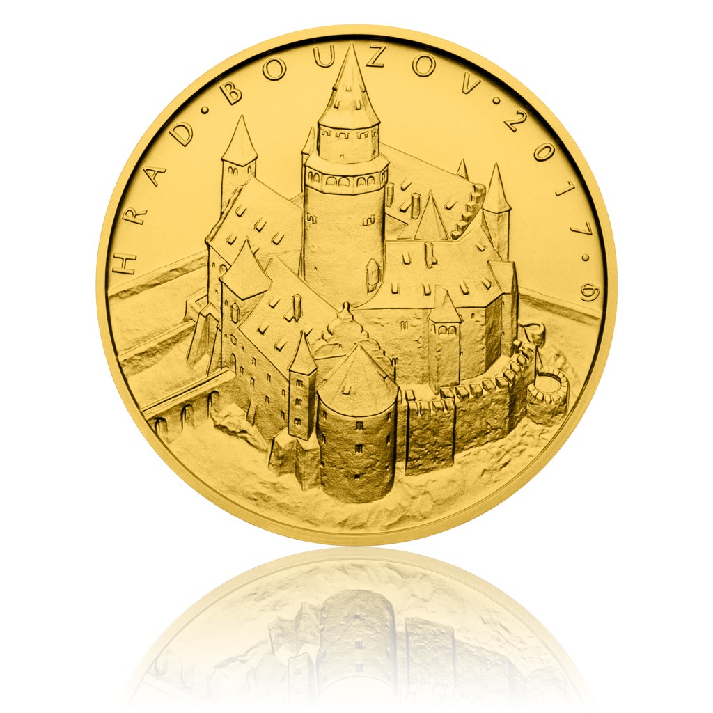 Na třetí 5000Kč zlaté minci z cyklu České národní banky, který představuje nejkrásnější a nejzajímavější hradní stavby České republiky, se v kvalitě standard objevuje romantický hrad Bouzov.