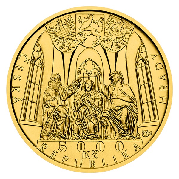 První cenu ve výtvarné soutěži České národní banky získal návrh medailéra Luboše Charváta, a to za originální ztvárnění oltáře v hradní kapli nanebevzetí Panny Marie na averzní straně. Kompozici averzu dotvářejí ještě heraldická zvířata České republiky. Reverzní straně mince dominuje kompozičně netradiční průhled skrz pozdně gotický portál na hradní nádvoří.
