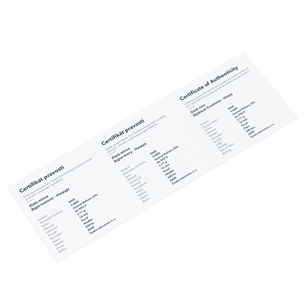 Zlatá mince Bájní tvorové - Harpyje proof