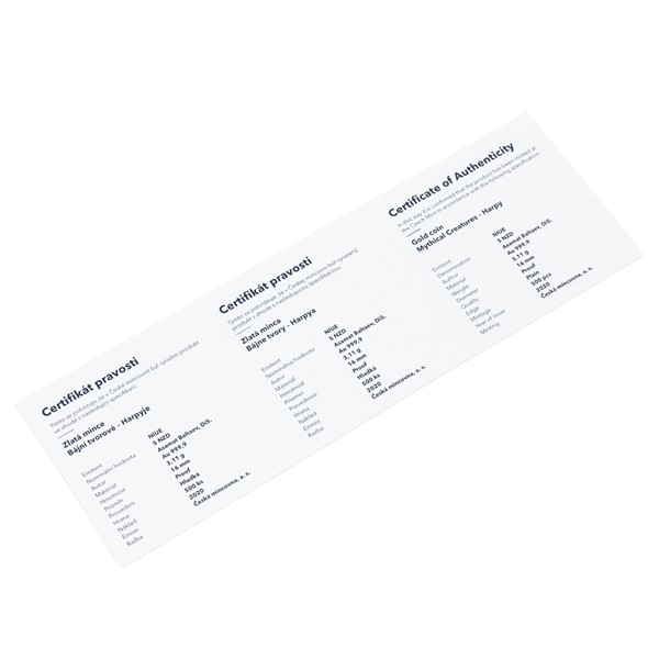Na čtvrté zlaté minci České mincovny ze sběratelského cyklu Bájní tvorové se objevuje harpyje.