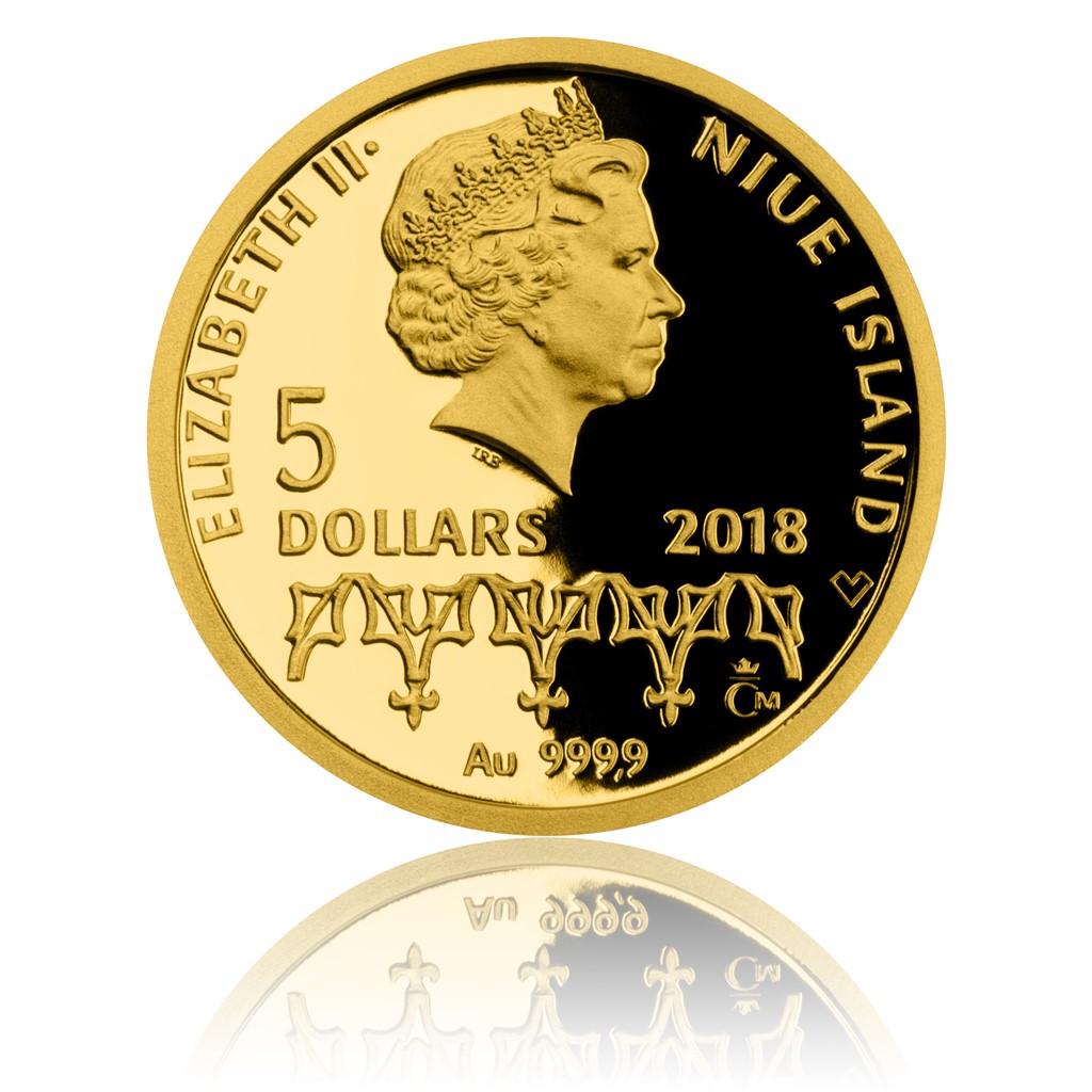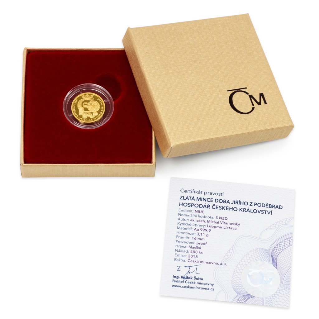 „Návrh předkládá iniciálu »G« – jako Gyrzy – s korunkou a pražským grošem Jiřího z Poděbrad v pozadí. Královu hospodárnost vyjadřují rozdílně vysoké sloupky sčítaných mincí,“ popisuje reverzní stranu ražby její autor ak. soch. Michal Vitanovský. Pamětní mince České mincovny vycházejí pod licencí zahraničního vydavatele, kterým je ostrov Niue, a jejich averzní strana proto nese jeho nezbytné atributy – jméno a profil královny Alžběty II., nominální hodnotu 5 DOLLARS (NZD) a rok emise 2018. Mezi tyto náležitosti je zakomponován ještě dobový dekor – čtveřice gotických kružeb s liliemi.