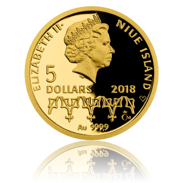 Reverzu mince, kterou již tradičně připravil expert na historická témata ak. soch. Michal Vitanovský, vévodí trojice postav doplněná třemi erby. Prostřední postava patří králi Jiřímu a erb náleží jeho rodu pánů z Kunštátu a Poděbrad. Další dvě postavy patří Jiříkovým manželkám. „Vzhledem k chybějícím dobovým zobrazením jde na tomto návrhu v obou případech o fiktivní portréty. Obě ženy doprovází rodové erby, křestní jména a dále je rozlišuje koruna na hlavě královny Johany. Návrh rezignuje na uvádění jmen četných dětí. Zastupují je symbolické květy lilií v rukou matek – sedm jich drží Kunhuta, tři Johana,“ vysvětluje Michal Vitanovský. Kompozici reverzní strany uzavírá opis JIŘÍ Z PODĚBRAD – MANŽEL A OTEC. Protože pamětní mince České mincovny vycházejí v licenci ostrova Niue, jejich averzní strana nese nezbytné atributy tohoto zahraničního emitenta – portrét a jméno královny Alžběty II., letopočet emise 2018 a nominální hodnotu 5 DOLLARS (NZD). Tyto náležitosti doplňuje čtveřice dekorativních gotických kružeb.