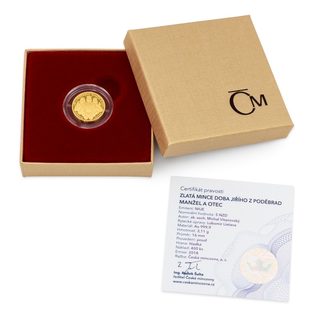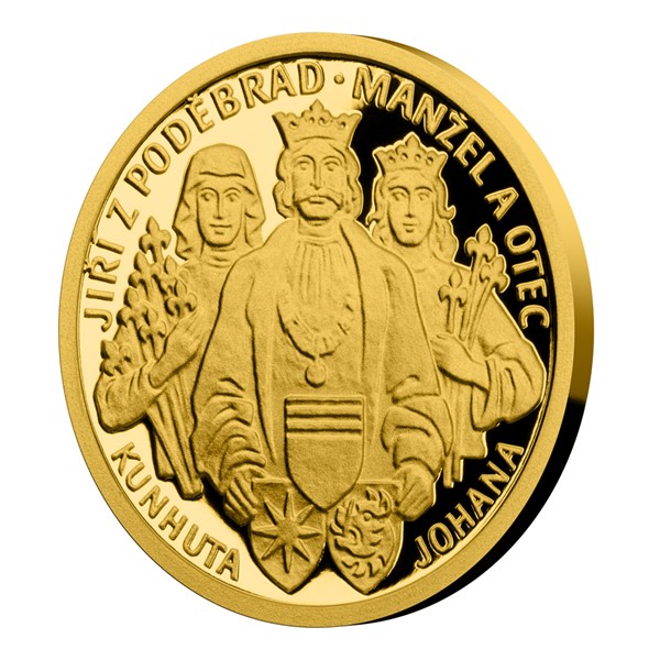 Jiří z Poděbrad byl dvakrát ženatý a zplodil celkem deset dětí. Obratnou sňatkovou politikou navázal silné vztahy s mnoha mocnými šlechtickými rody, a pokračoval tak ve snaze zajistit Českému království místo na slunci. Závěrečná zlatá mince České mincovny z minisérie Doba Jiřího z Poděbrad proto náleží králi v úloze manžela a otce.