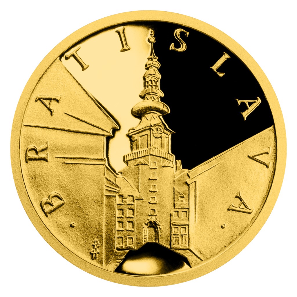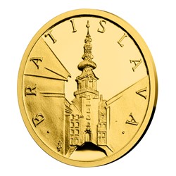 Reverzní strana zlaté mince předkládá pohled na bratislavskou dominantu s