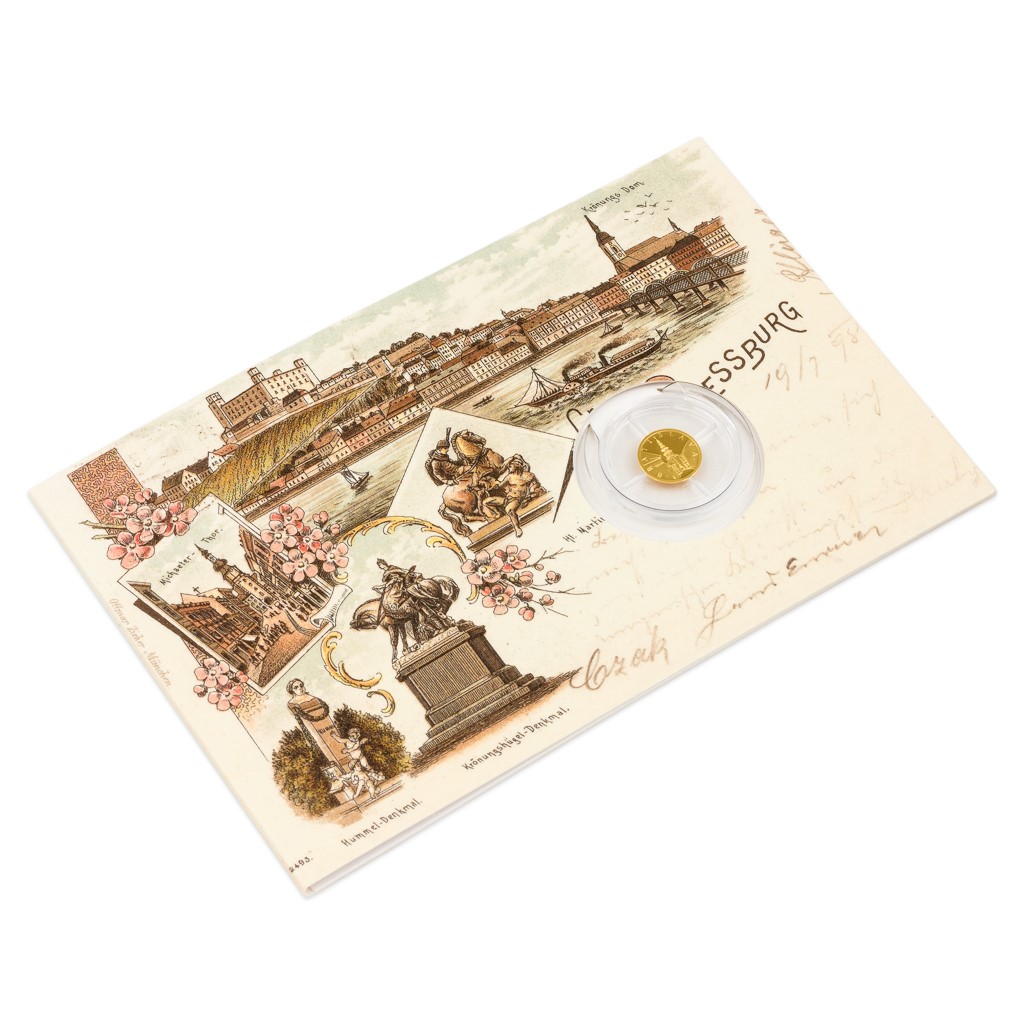 Třetí zlatá minimince České mincovny se slovenským motivem, která je zasazena do repliky historické pohlednice, je věnována Michalské bráně.