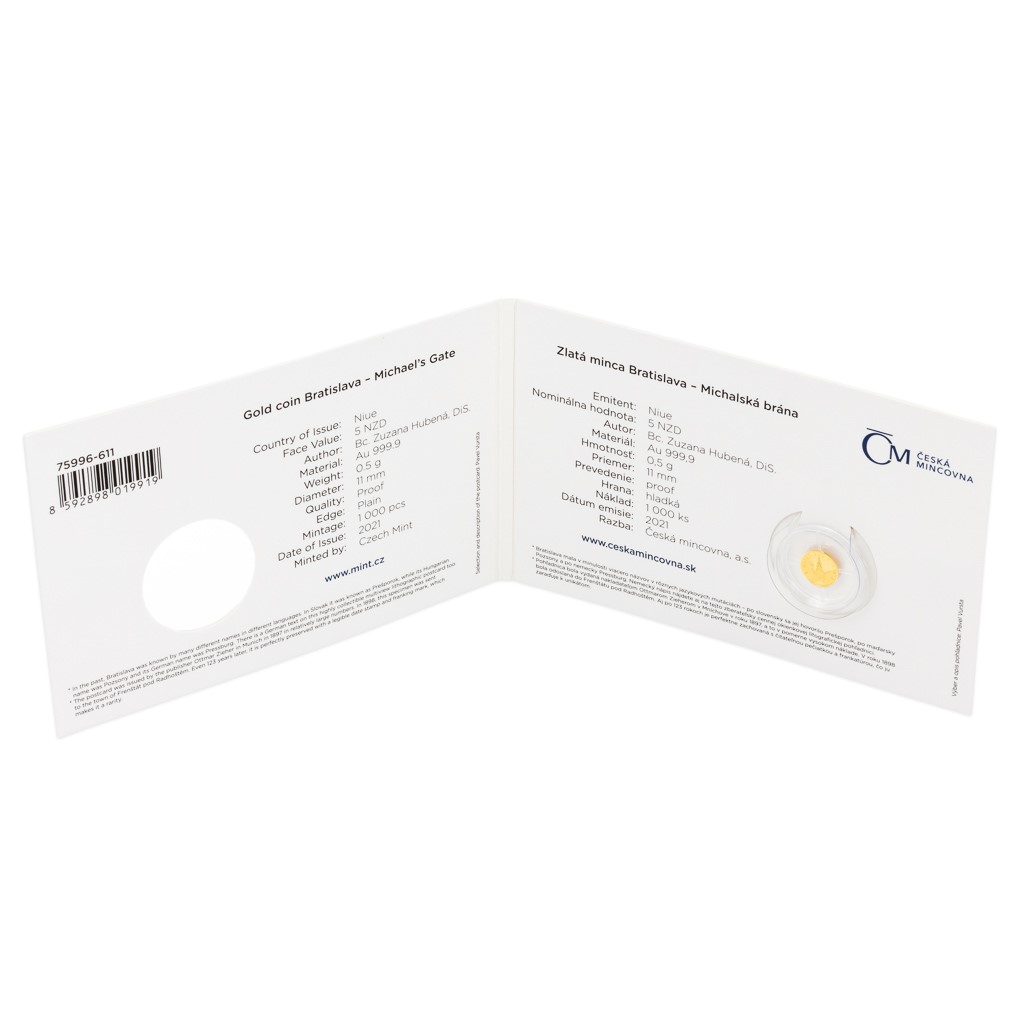 cibulovitou střechou. Kompozici dotváří slovensko-anglický opis MICHALSKÁ BRÁNA – MICHAEL‘S GATE. Protože mince České mincovny vycházejí v licenci zahraničního emitenta, kterým je ostrov Niue, averzní strana nese jeho nezbytné atributy – nominální hodnotu 5 DOLLARS (NZD), jméno a portrét královny Alžběty II. a rok vydání 2021.