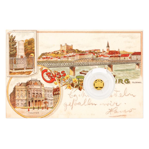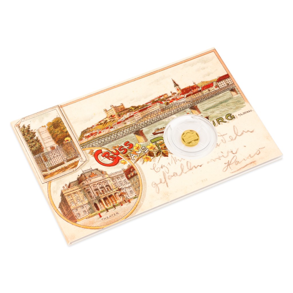 Slovenské hlavní město mělo v minulosti řadu názvů v různých jazykových mutacích – například v němčině se jmenovalo Pressburg. Město na Dunaji bylo korunovačním městem uherských králů a v současnosti je nejmladším hlavním městem Evropy. Historicky významnou a turisticky zajímavou metropoli nemohl minout nový fenomén pohlednicové tvorby, který se objevil na konci 19. století. Jako předloha balení mince posloužila sběratelsky vyhledávaná a cenná litografie, kterou v roce 1896 vydal vídeňský litografický ústav Schneider & Lux a která byla téhož roku odeslána s čitelnou frankaturou do Limburgu. Zdobná okénková pohlednice předkládá německý nápis GRUSS AUS PRESSBURG (pozdrav z Bratislavy) a zachycuje významné stavby a památky města – například panorama Bratislavského hradu a budovu bratislavského městského divadla, které původně sloužilo německým a maďarským sborům, ale roku 1920 se stalo sídlem Slovenského národního divadla.