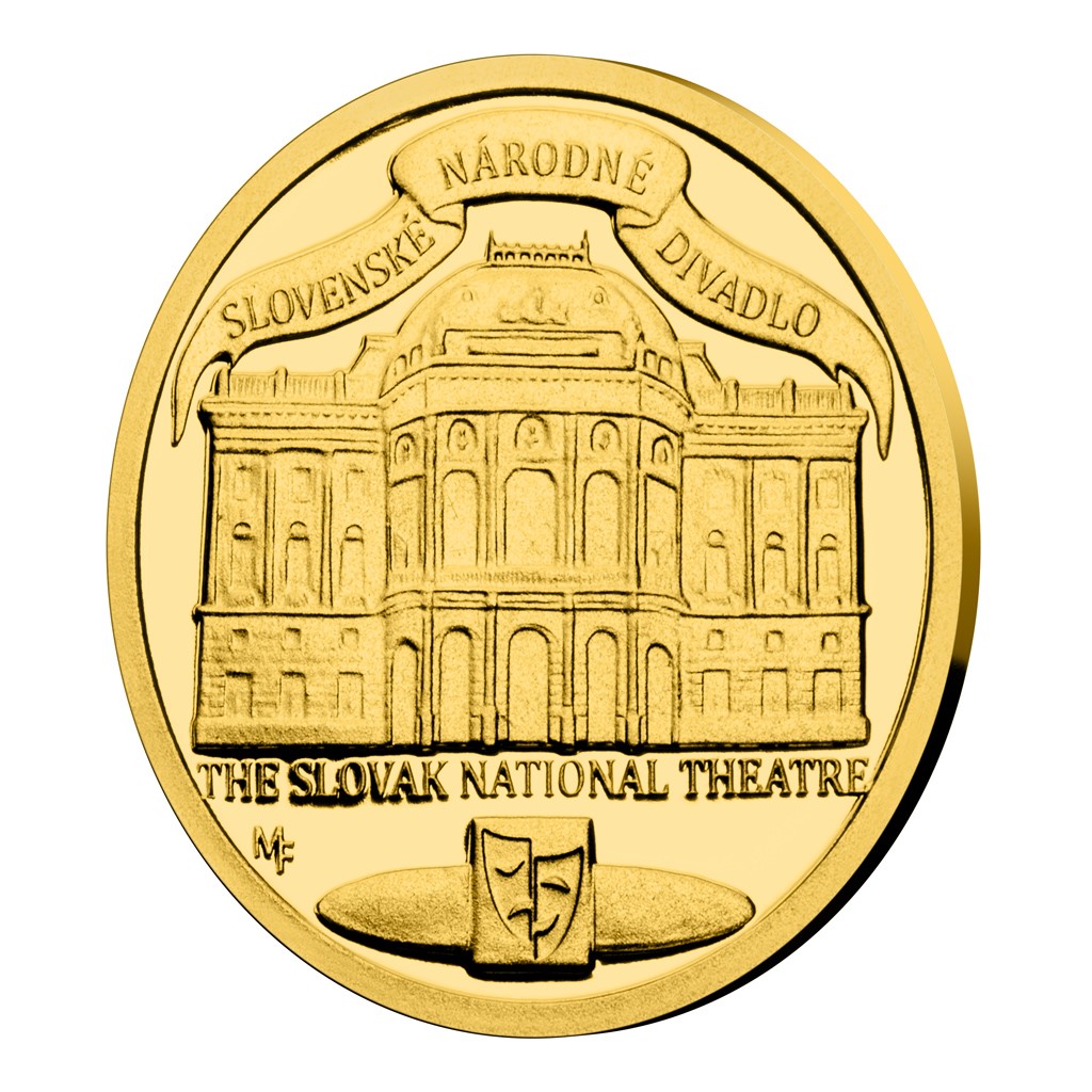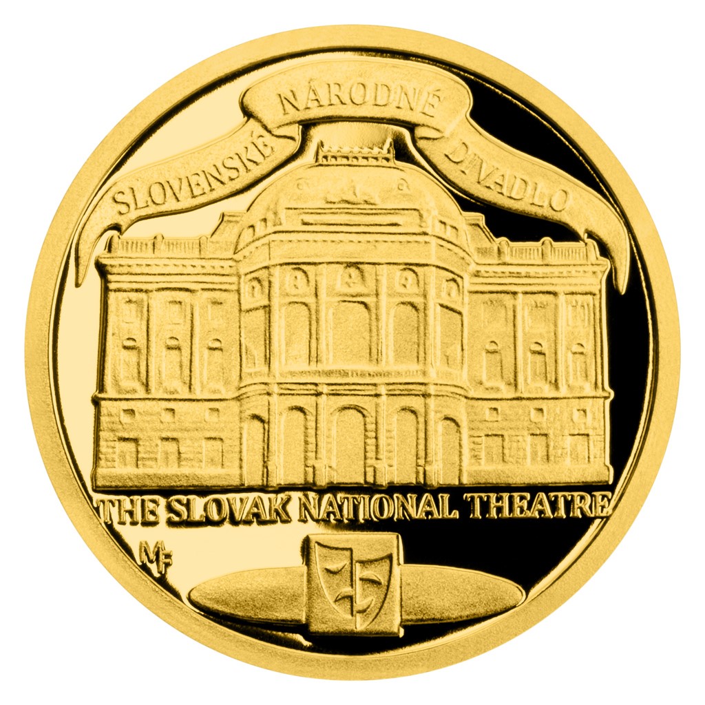 Pohledu na novorenesanční divadelní budovu je věnována reverzní strana zlaté mince, která je dílem mladého medailéra Matěje Funka. Kompozici reverzu dotváří slovensko-anglický opis SLOVENSKÉ NÁRODNÉ DIVADLO – THE SLOVAK NATIONAL THEATRE a vyobrazení symbolických divadelních masek. Protože mince České mincovny vycházejí v licenci zahraničního emitenta, kterým je ostrov Niue, averzní strana nese jeho nezbytné atributy – nominální hodnotu 5 DOLLARS (NZD), jméno a portrét královny Alžběty II. a rok vydání 2020.