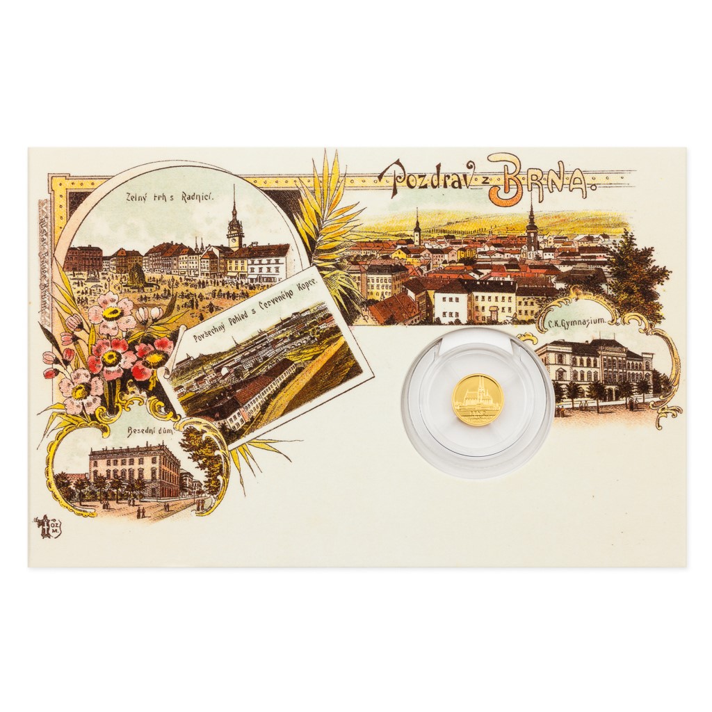 V cyklu pamětních mincí vyražených z jedné poloviny gramu ryzího zlata, které jsou zasazeny do replik historických pohlednic, se podruhé objevuje Brno.