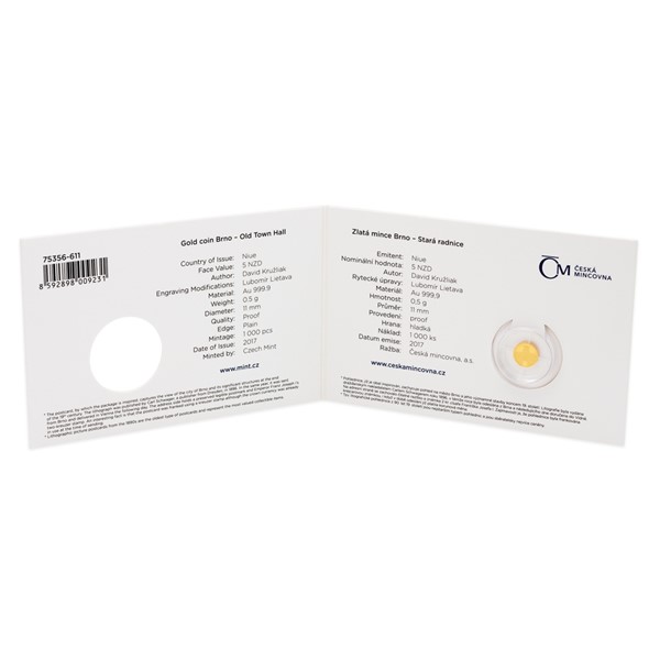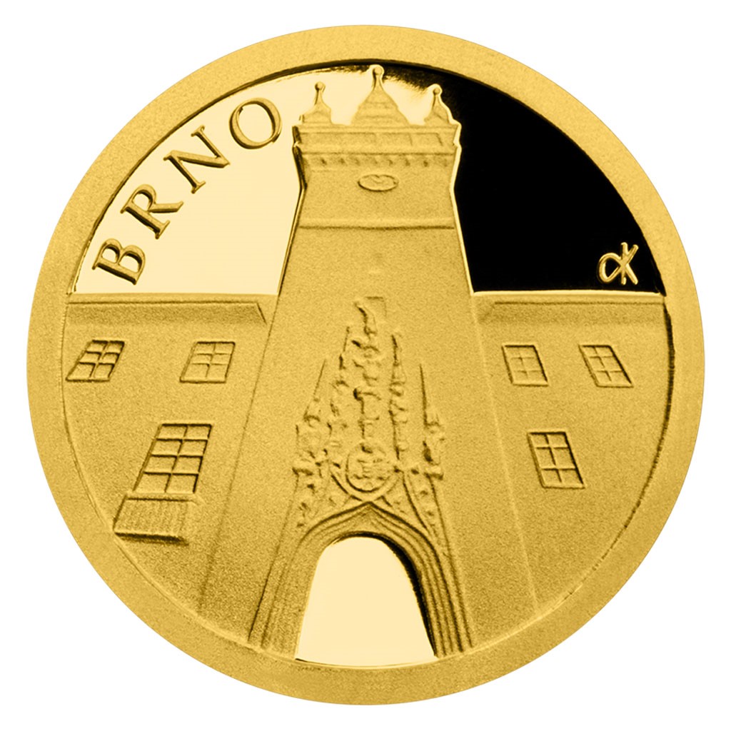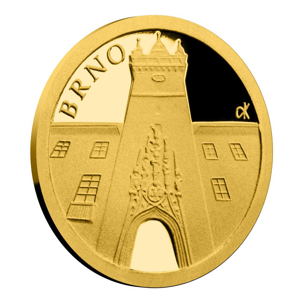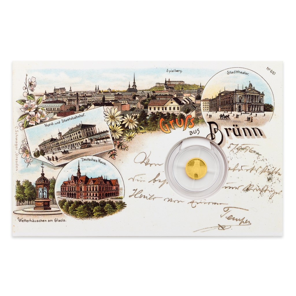 Česká mincovna představuje již třetí emisi půlgramové zlaté mince uložené do repliky dobové litografické pohlednice. Je věnována velikému městu Brnu a jeho Staré radnici, která je opředena pověstmi.