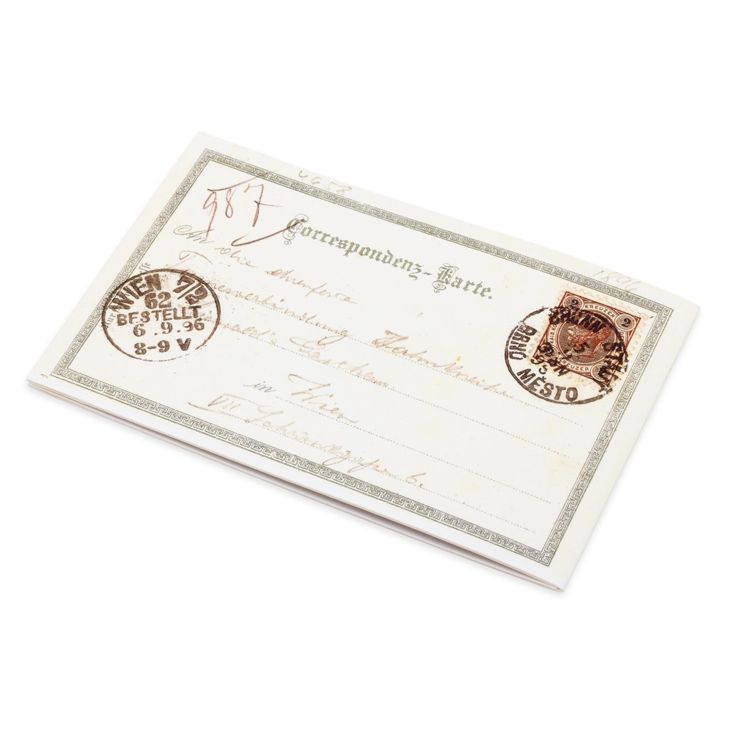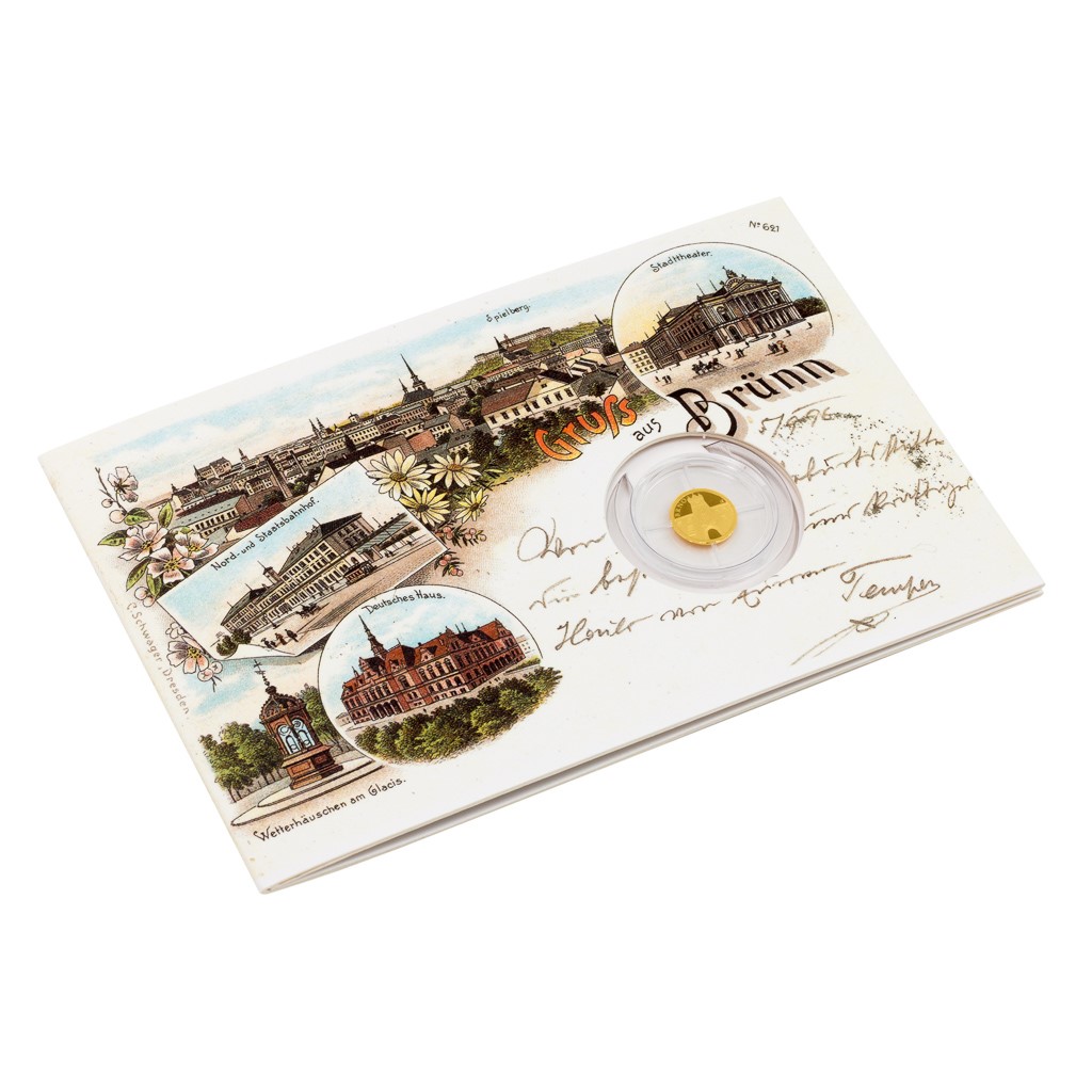 Brněnská pohlednice zachycuje celkový pohled na moravskou metropoli z konce 19. století, které vévodí hrad Špilberk. Nabízí také několik záběrů na další místní pamětihodnosti: dnešní Mahenovo divadlo, hlavní nádraží, Německý dům i jednu již neexistující kuriozitu – meteorologické zařízení, tzv. Větrníček na Kolišti. Názvy všech těchto staveb jsou uvedeny v německém jazyce a stejně je tomu i v případě ozdobného nápisu „Gruss aus Brünn“. V době, ze které „Pozdrav z Brna“ pochází, totiž ve městě dominovala německá většina. Pohlednice byla vydána drážďanským nakladatelem Carlem Schwagerem roku 1896. Konkrétní exemplář, který se stal předlohou balení mince, byl v témže roce odeslán z Brna a již následujícího dne doručen do Vídně. Zajímavostí je, že byl frankován dvoukrejcarovou známkou, i když v době odeslání již platila korunová měna.