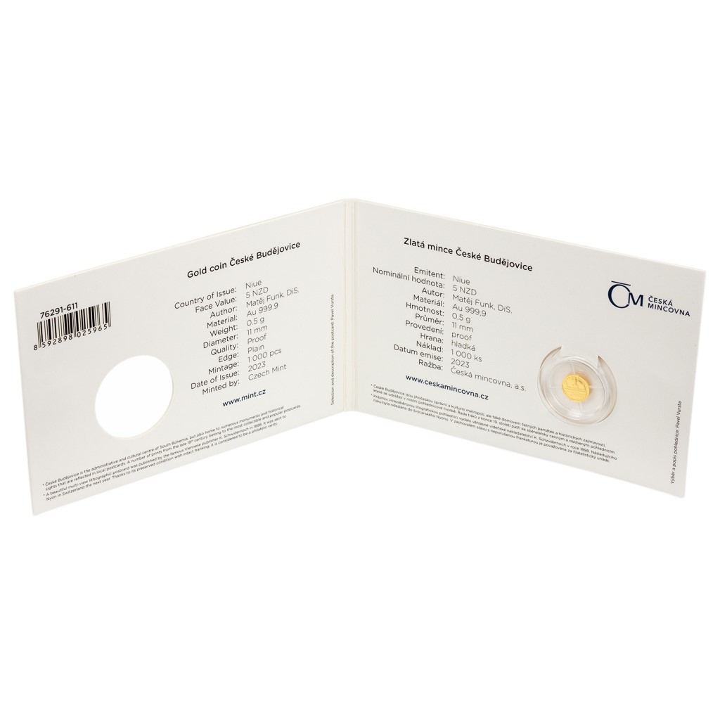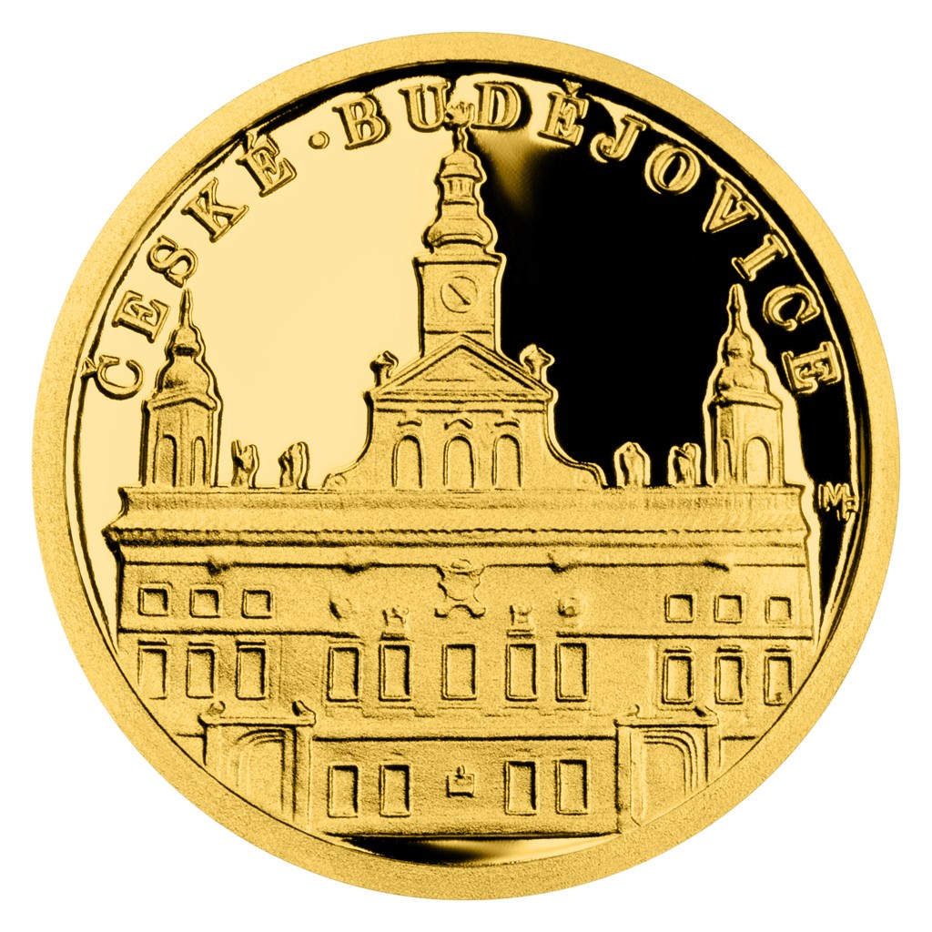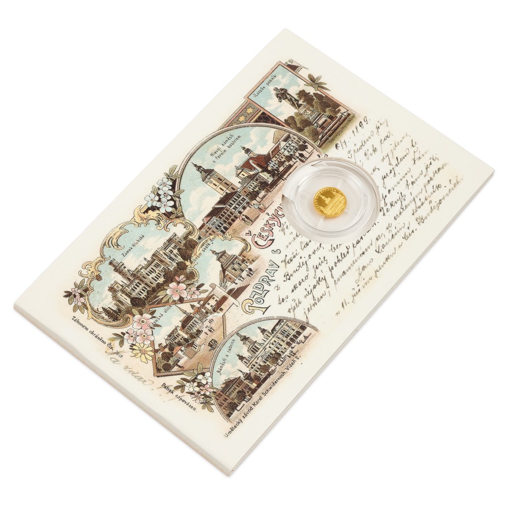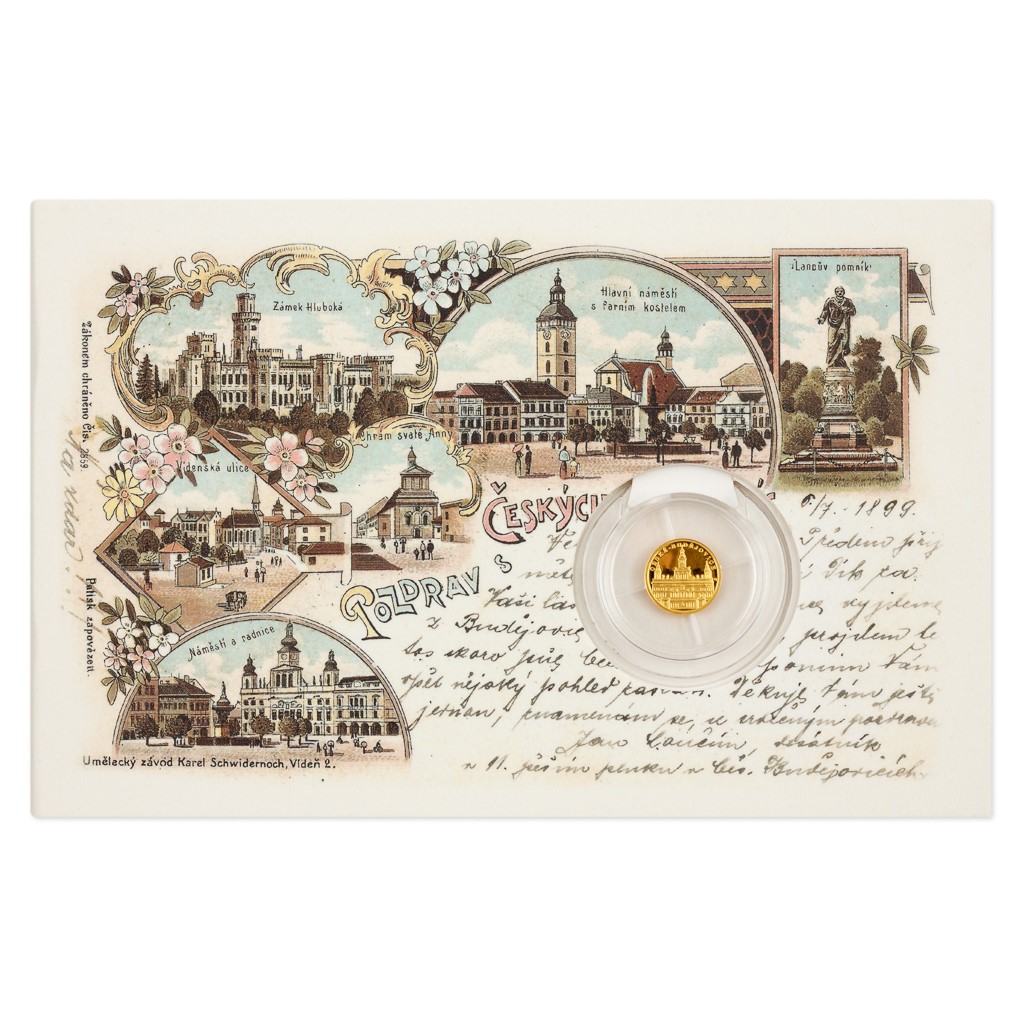 Dalším městem, kterému je věnována zlatá minimince České mincovny zasazená do repliky historické pohlednice, se staly České Budějovice.