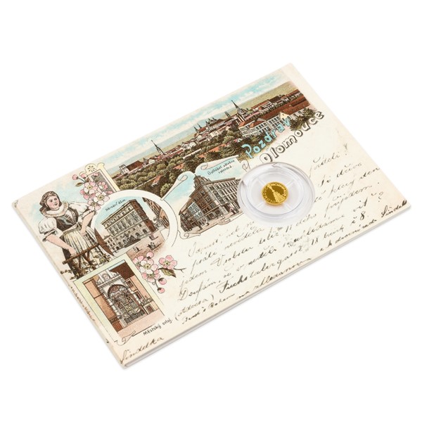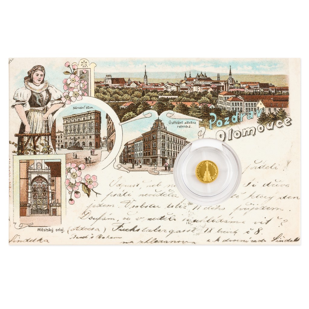 Dalším významným městem, které se objevuje na zlaté miniminci České mincovny zasazené do repliky historické pohlednice z přelomu 19. a 20. století, je Olomouc.
