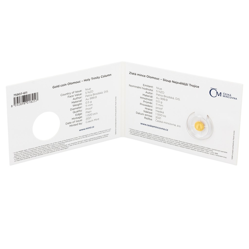 Samotná mince, která je dílem medailérky Petry Brodské, DiS., je věnována sloupu Nejsvětější Trojice – 35 metrů vysoké barokní stavbě s kaplí a přepychovou sochařskou výzdobou, která vznikla jako projev díků za přečkanou morovou epidemii a která se stala památkou UNESCO. Protože mince České mincovny vycházejí v licenci zahraničního emitenta, kterým je ostrov Niue, averzní strana nese jeho nezbytné atributy – nominální hodnotu 5 DOLLARS (NZD), jméno a portrét královny Alžběty II. a rok vydání 2021.