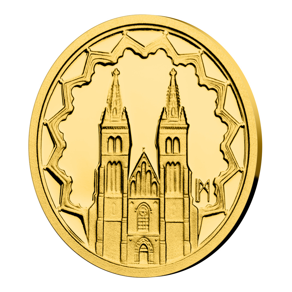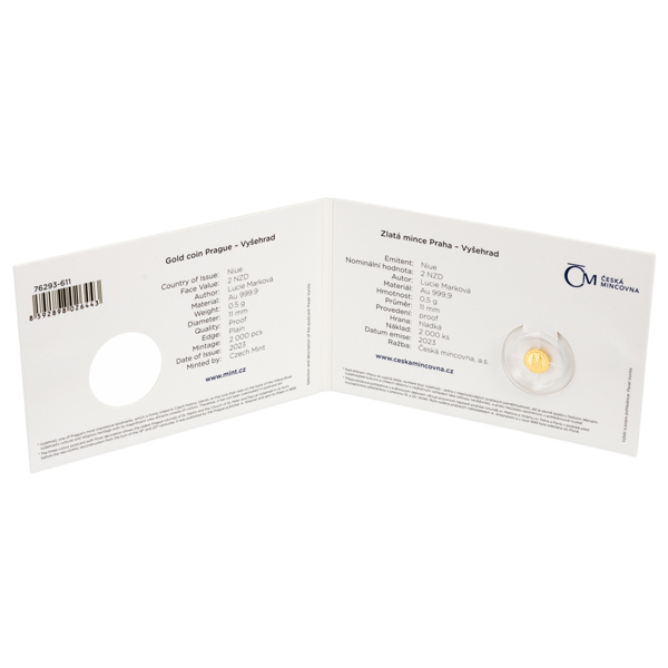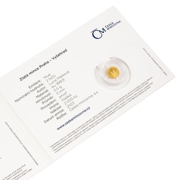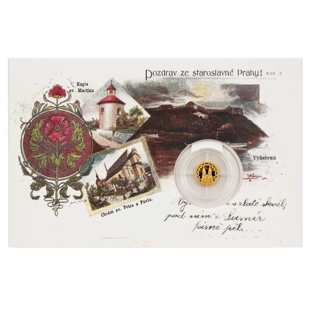 Další pražskou pamětihodností, která se objevuje na zlaté miniminci České mincovny zasazené do repliky historické pohlednice, je Vyšehrad.