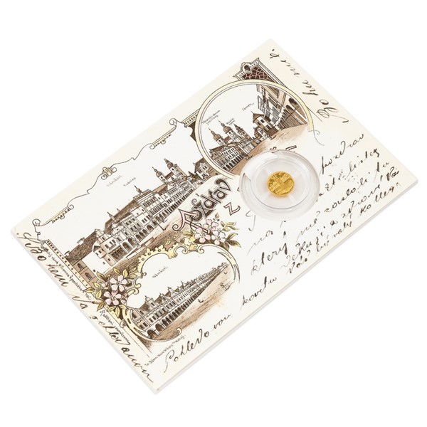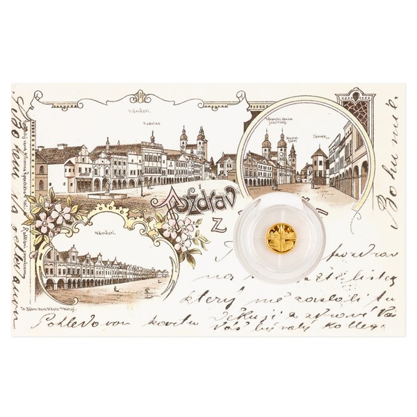 Dalším městem, kterému je věnována zlatá minimince České mincovny zasazená do repliky historické pohlednice, se stala Telč.