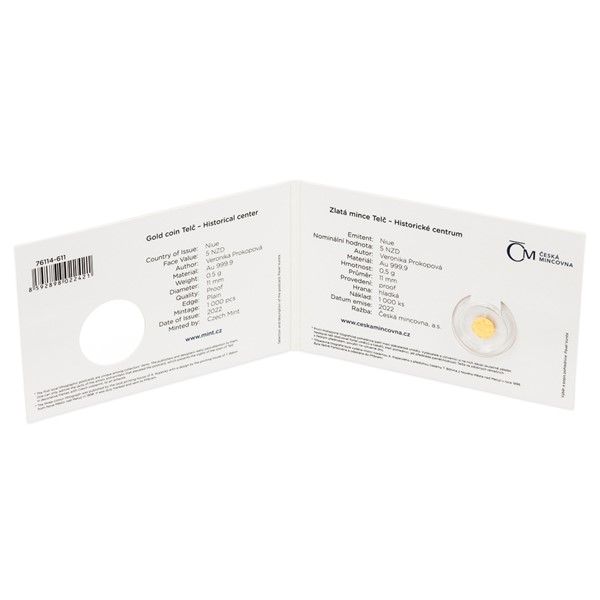 Historickému jádru Telče – moravského města, které se nachází v půli cesty mezi Prahou a Vídní – vévodí královská vodní tvrz, rozsáhlý zámecký areál se zahradou a parkem, a především náměstí s nenarušeným komplexem historických domů. Tyto měšťanské stavby v renesančním, barokním a klasicistním stylu, které vynikají nezaměnitelnými podloubími a průčelími, jsou hlavním námětem pohlednice z konce 19. století, jež posloužila jako předloha balení mince. „První místopisné litografické pohlednice patří mezi sběratelské unikáty. Vydavatelé a výtvarníci si na nich dávali skutečně záležet. Nezbývá než obdivovat fortel umělců a tiskařů, kteří pohlednici, jež předkládá pamětihodnosti Telče ve zdobných rámečcích s českým předtiskem, povýšili na výtvarné dílo,“ říká znalec pohlednic Pavel Vursta.