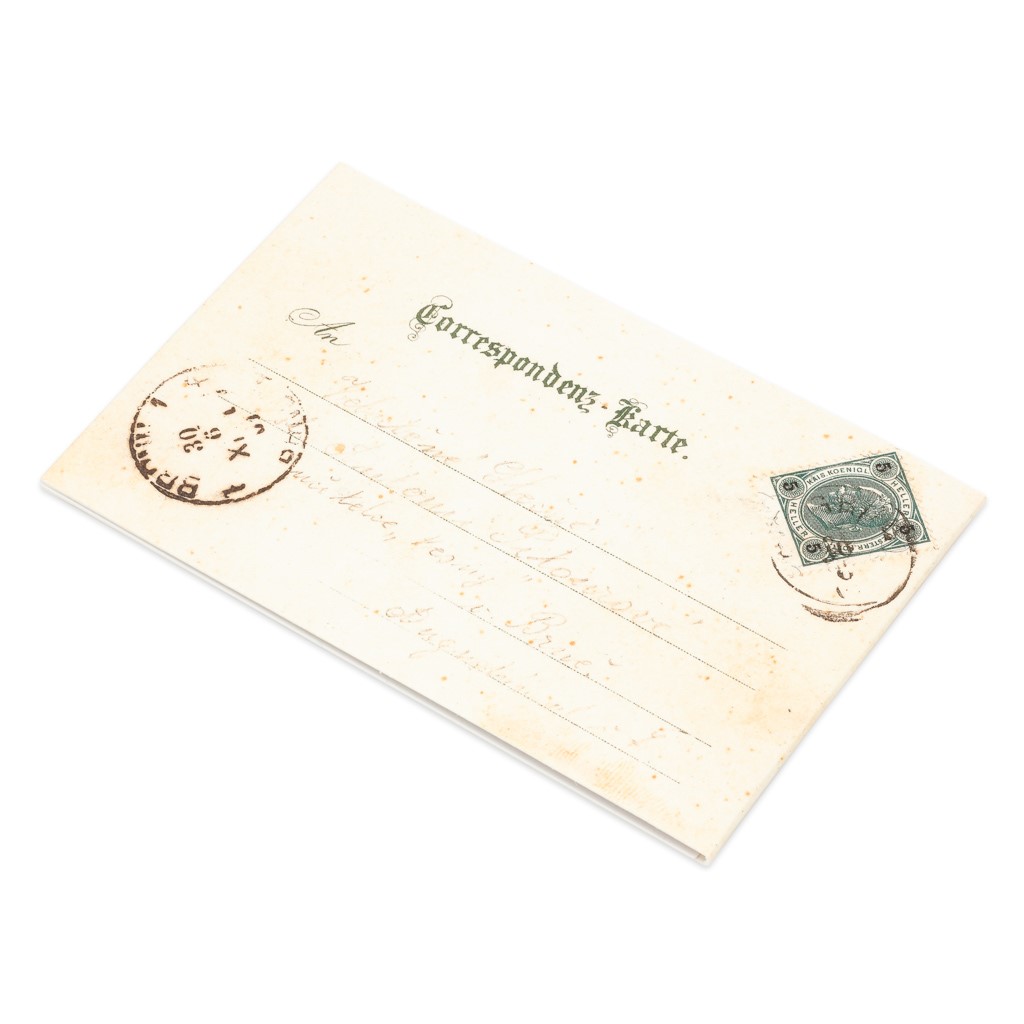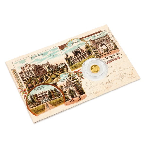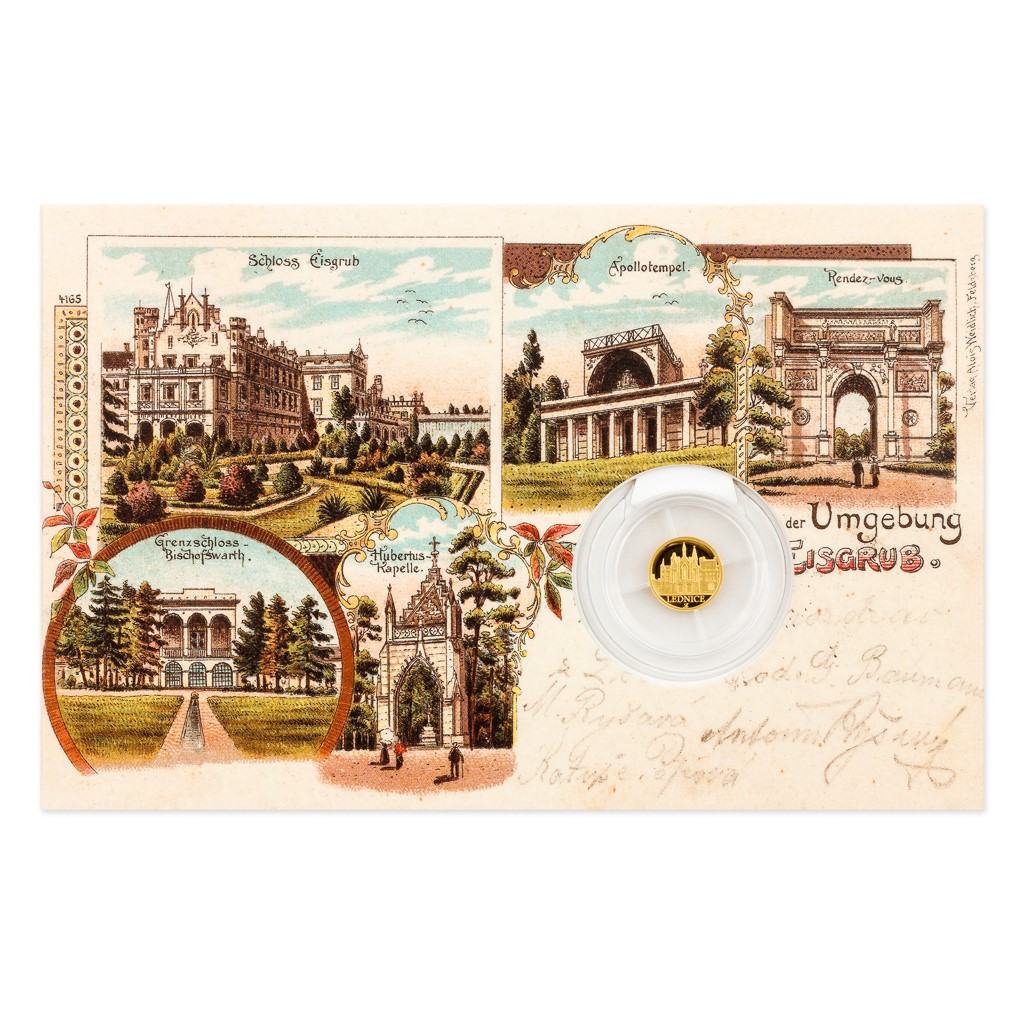 Pohlednicová tvorba věnovaná historické jihomoravské oblasti je velmi bohatá a představuje chloubu každé sbírky. Zdobnou okénkovou litografickou pohlednici, která posloužila jako předloha balení mince, vydalo nakladatelství Aloise Weidlicha (dříve Franz Hübl) v roce 1900. Tisk zachycuje významné stavby a památky lednicko-valtického areálu, ve kterém se snoubí přírodní krásy a nevšední kulturní památky. Majestátní zámek Lednice (Schloss Eisgrub) je obklopen rozlehlými parky, zahradami, rybníky a množstvím saletů, tedy menších staveb roztroušených po okolí. V těchto architektonických perlách se mísí nespočet tradičních i pro střední Evropu exotických stylů – návštěvníci se mohou kochat například řeckým Apollonovým chrámem (Apollotempel), římským vítězným obloukem Dianina chrámu (Rendez--vous), klasicistním Hraničním zámečkem (Grenzschloss – Bischofswarth) či novogotickou kaplí svatého Huberta (Hubertus-Kapelle).