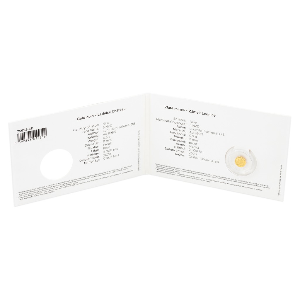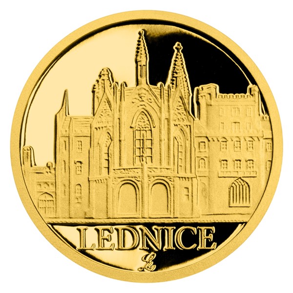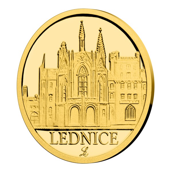 Další emise z volného cyklu zlatých minimincí zasazených do replik historických pohlednic je věnována zámku Lednice a jeho okolí, které je zapsáno na seznamu světového dědictví UNESCO.