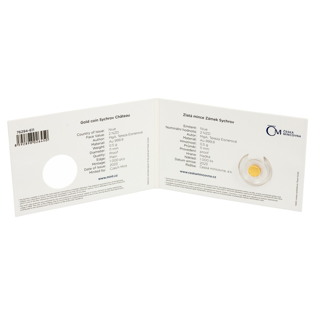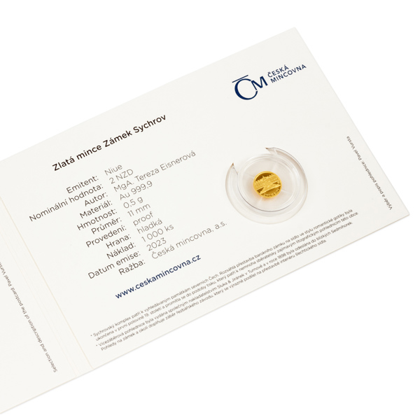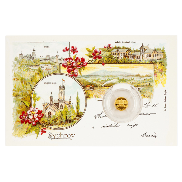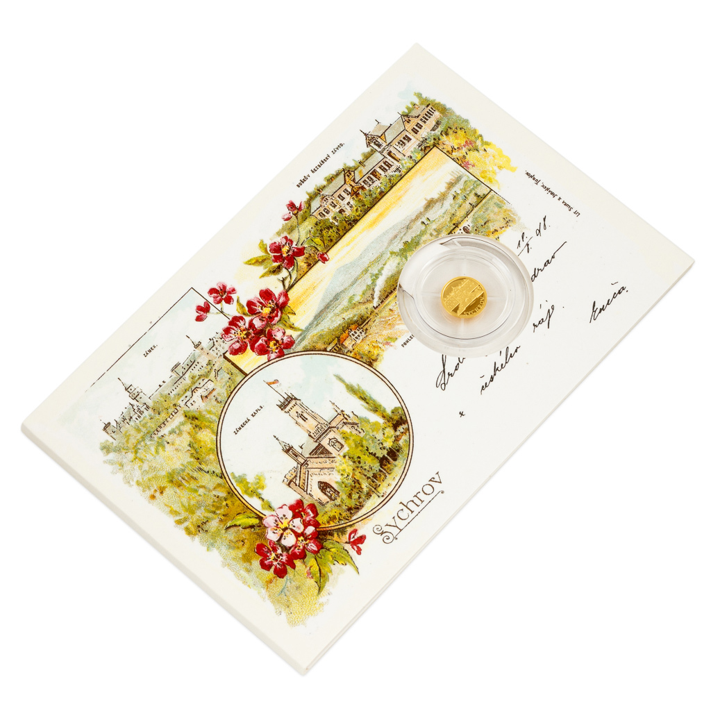 Další pamětihodností, které je věnována zlatá minimince České mincovny zasazená do repliky historické pohlednice, se stal zámek Sychrov.
