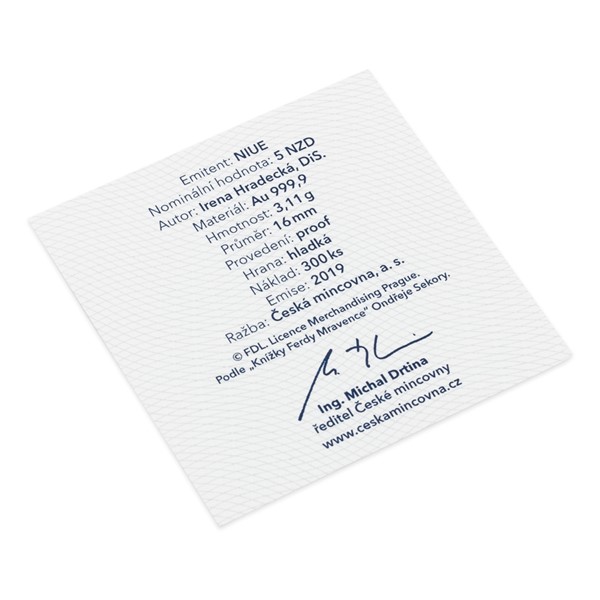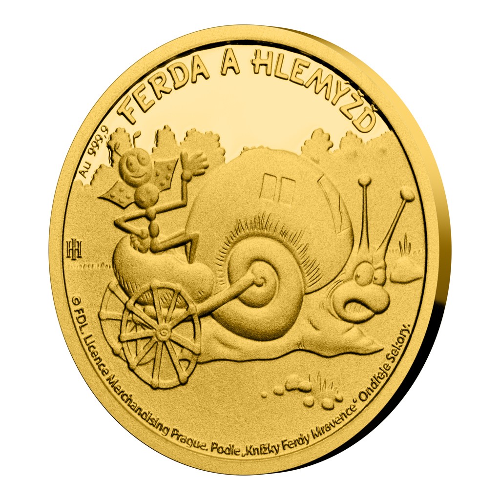 Poslední zlatá mince České mincovny z pohádkové sběratelské minisérie se vrací na samý začátek příběhu Ferdy Mravence. Připomíná, jak hmyzí hrdina vytrestal pana Hlemýždě, který mu odmítl pomoci v nouzi.