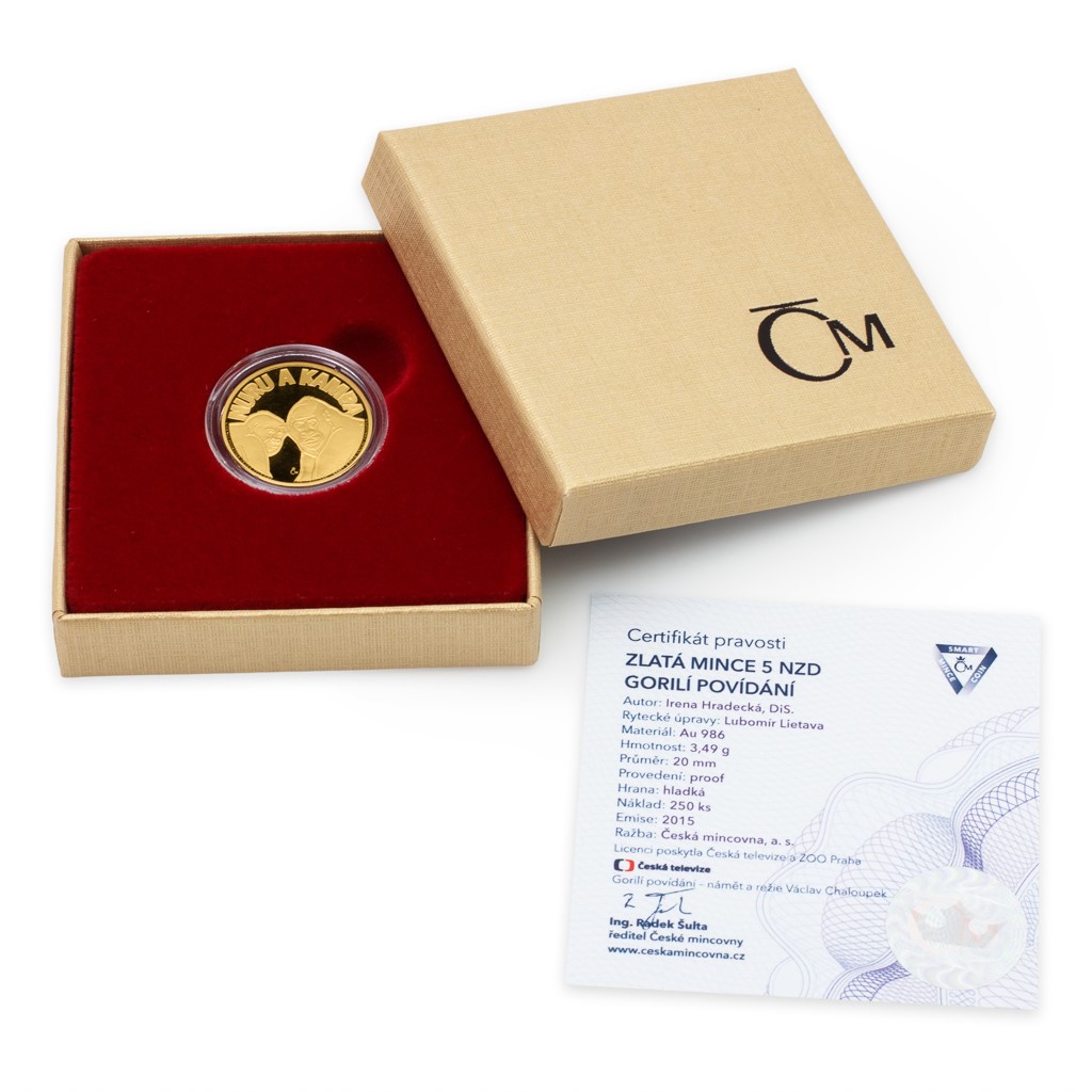 Hraných Večerníčků za dobu existence tohoto televizního formátu nevzniklo tolik jako těch animovaných. Pro svou nádhernou autentičnost však patří mezi vyhledávaná díla. Nejinak tomu bude u emise mince z ryzího zlata, kterou na reverzu zdobí portréty gorilího mláděte Nuru a jeho tetičky Kamby. Oba večerníčkové hrdiny zpracovala talentovaná výtvarnice Irena Hradecká, DiS a doplnila je logem České televize a Zoologické zahrady hlavního města Prahy. Averz pak nese nezbytné atributy emitenta. Krásná sběratelská mince Gorilí povídání se stane originálním přírůstkem Vašich sbírek a navíc poslouží coby hodnotný dárek pro malé numismatiky. Jedinečné zlaté mince můžete nyní uložit do pestrého sběratelského alba.