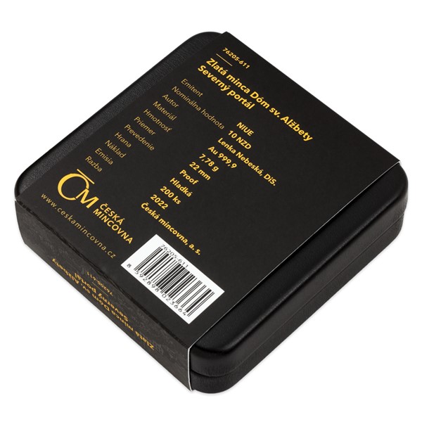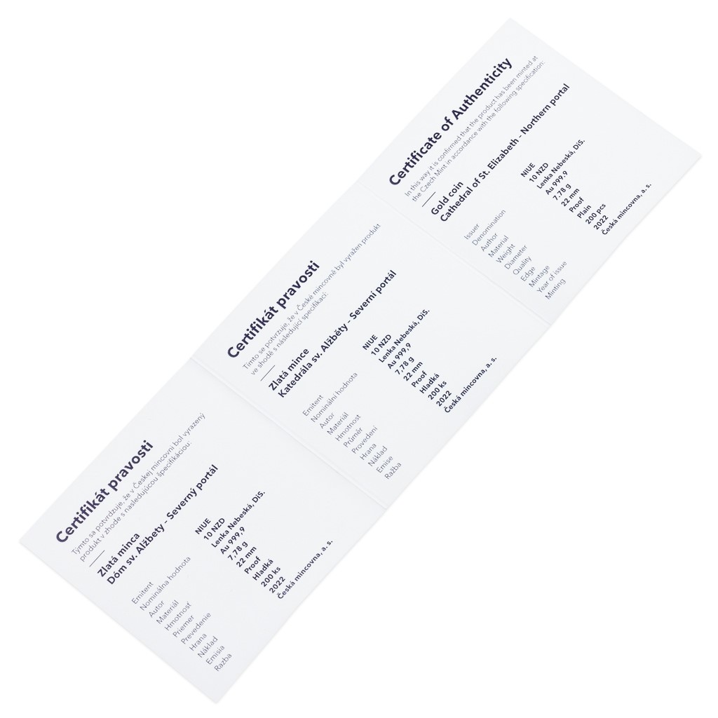 najdete na reverzní straně mince, která je dílem medailérky Lenky Nebeské, DiS. Kompozici reverzu dotváří slovenský opis SEVERNÝ PORTÁL. Protože se jedná o minci vydávanou v zahraniční licenci ostrova Niue, nese averzní strana nezbytné atributy tohoto emitenta – jméno a portrét královny Alžběty II., nominální hodnotu 10 DOLLARS a rok emise 2022. To vše doplňují gotické ornamenty.