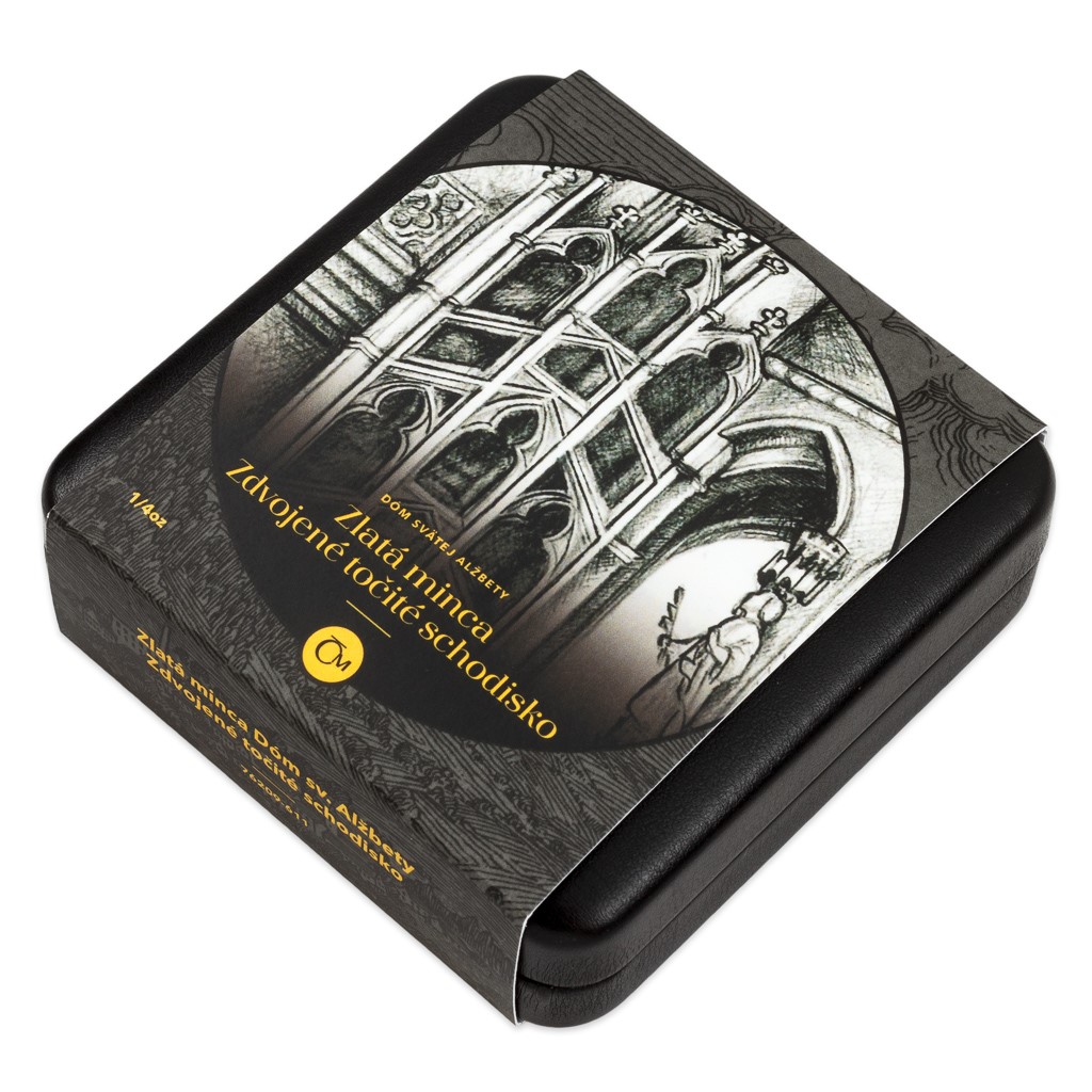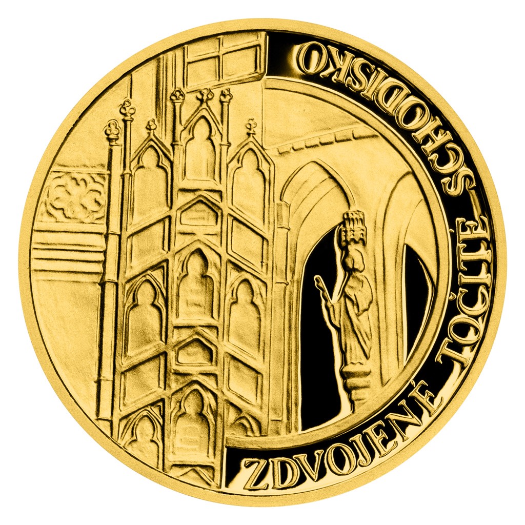 Závěrečná zlatá mince České mincovny ze čtyřdílné minisérie, která vzdává hold košické katedrále, nese vyobrazení zdvojeného točitého schodiště.