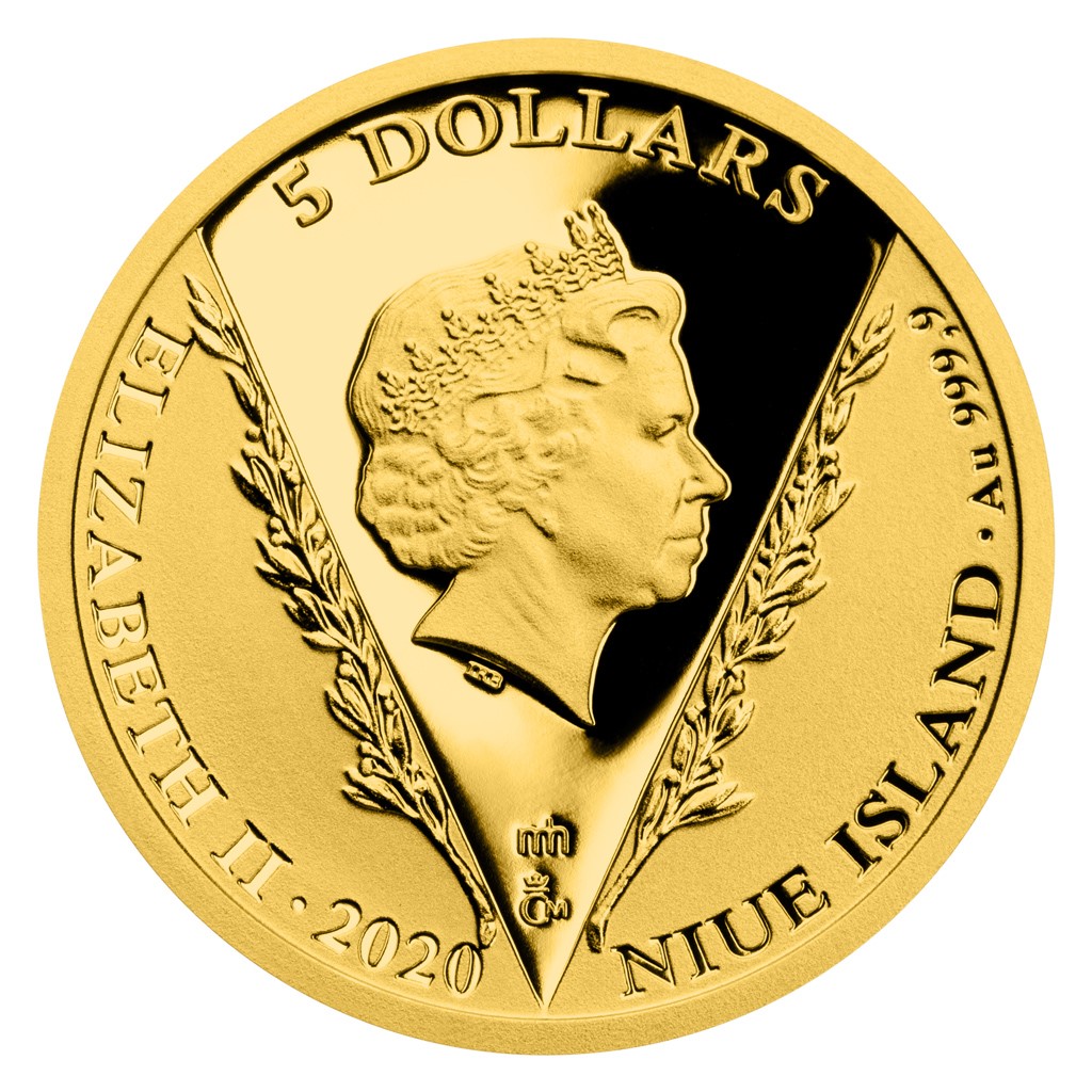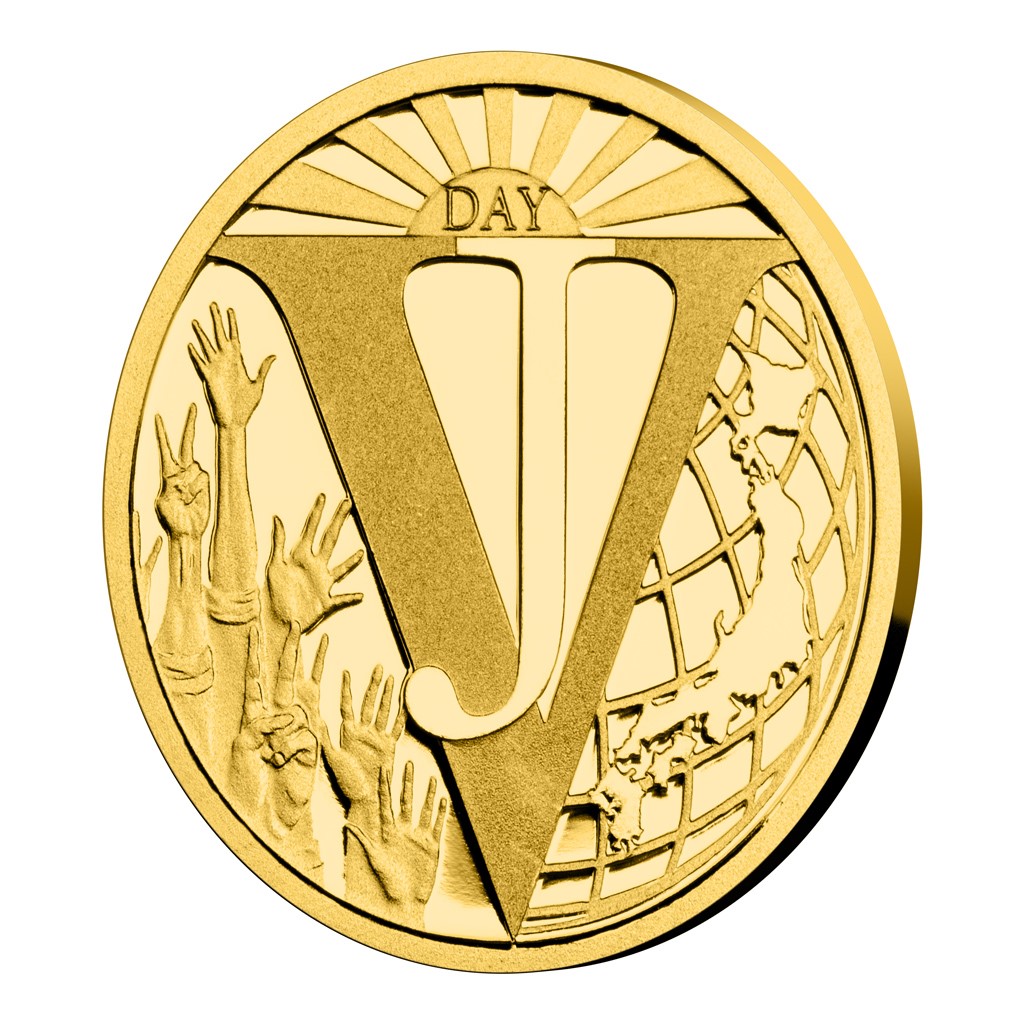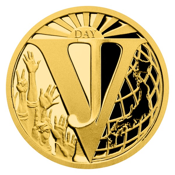 Reverzní straně mince, která je dílem Mgr. Art. Miroslava Hrice, ArtD., dominují písmena V a J, protože den vítězství nad Japonskem je ve světě známý jako V-J DAY. Kompozici dotvářejí vztyčené ruce oslavujících lidí, jejichž prsty tvoří charakteristické gesto – vítězné véčko. Dále na reverzu najdete vycházející slunce a mapu Japonska. Písmeno V jako vítězství evokuje i uspořádání averzní strany. Protože se jedná o minci vydávanou v zahraniční licenci ostrova Niue, nese averz nezbytné atributy tohoto emitenta – jméno a portrét královny Alžběty II., nominální hodnotu 5 DOLLARS a rok emise 2020.