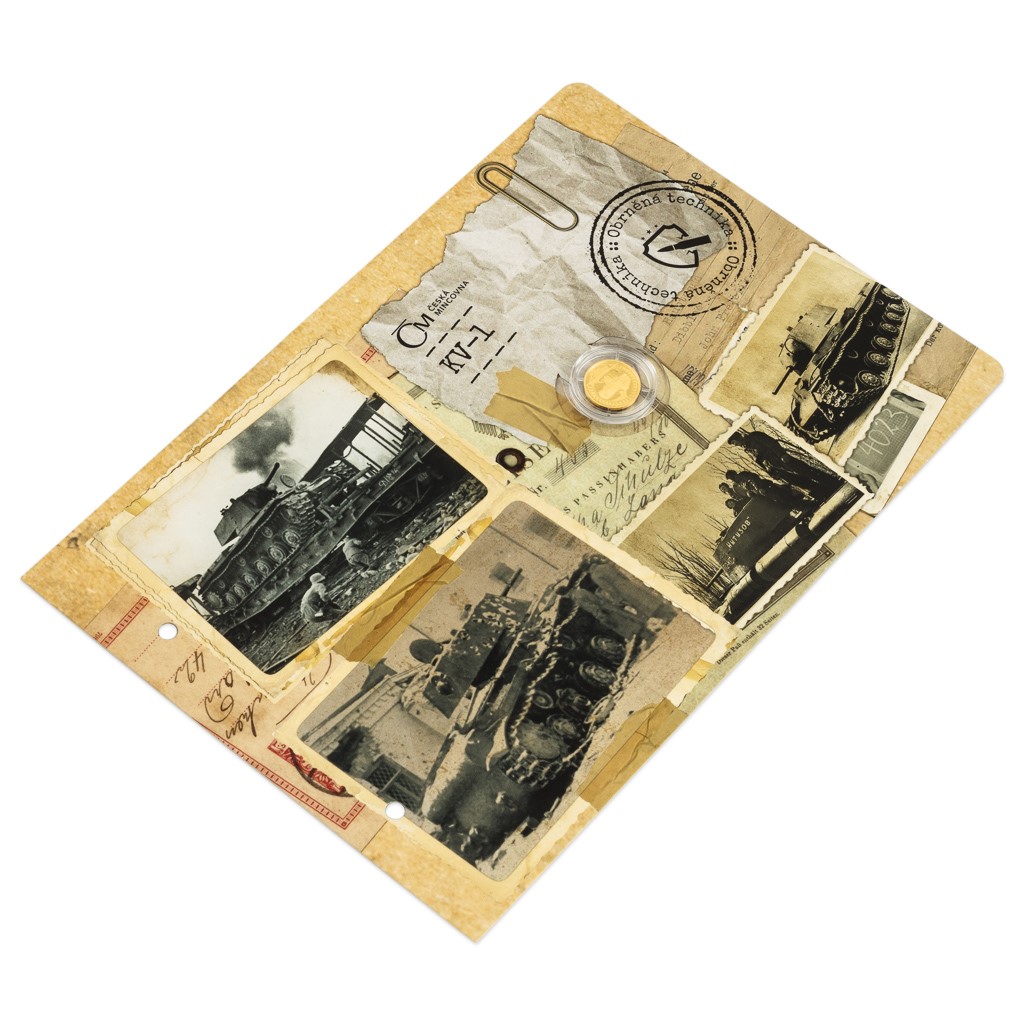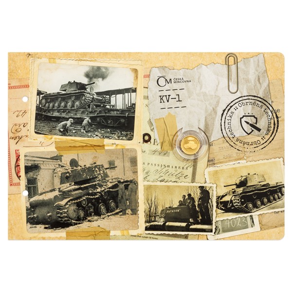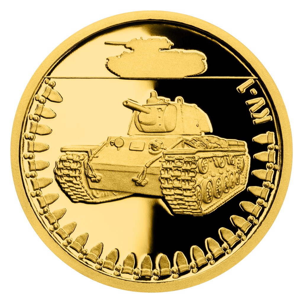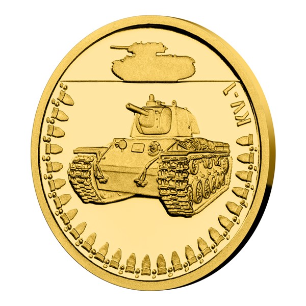 Na šesté zlaté minci České mincovny z cyklu Obrněná technika se objevuje sovětský tank KV-1, který sloužil za druhé světové války.