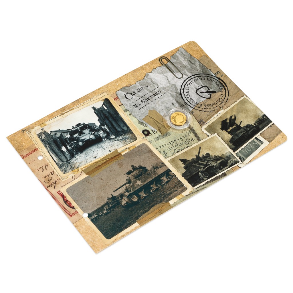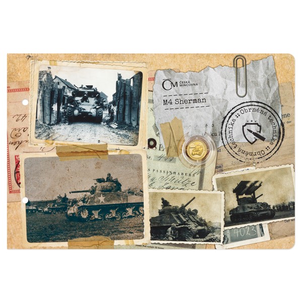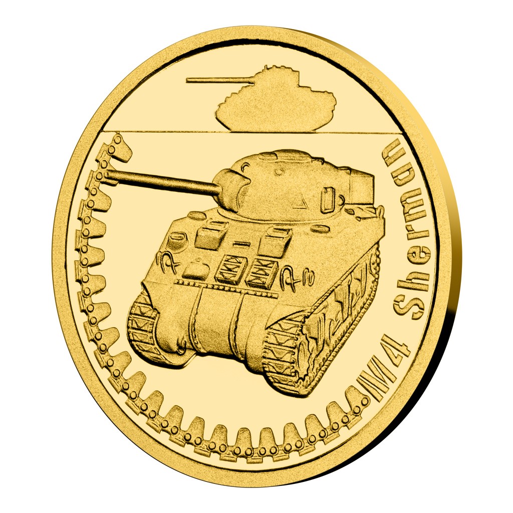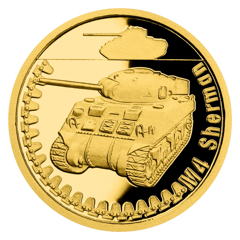 Na třetí zlaté minci České mincovny z cyklu Obrněná technika se objevuje americký tank M4 Sherman, který sloužil za druhé světové války.