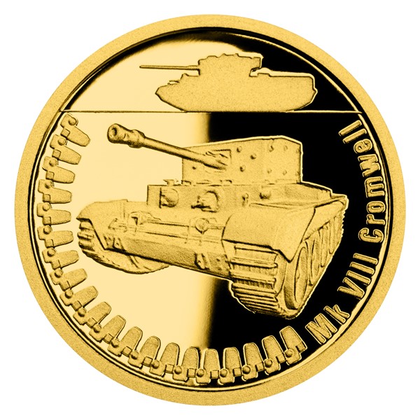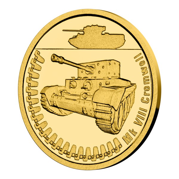 Na první zlaté minci České mincovny z cyklu Obrněná technika se objevuje britský tank Mk VIII Cromwell, který sloužil za druhé světové války.