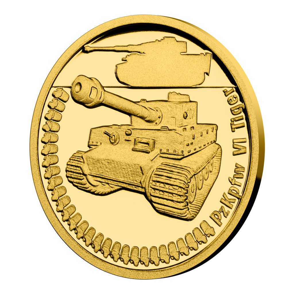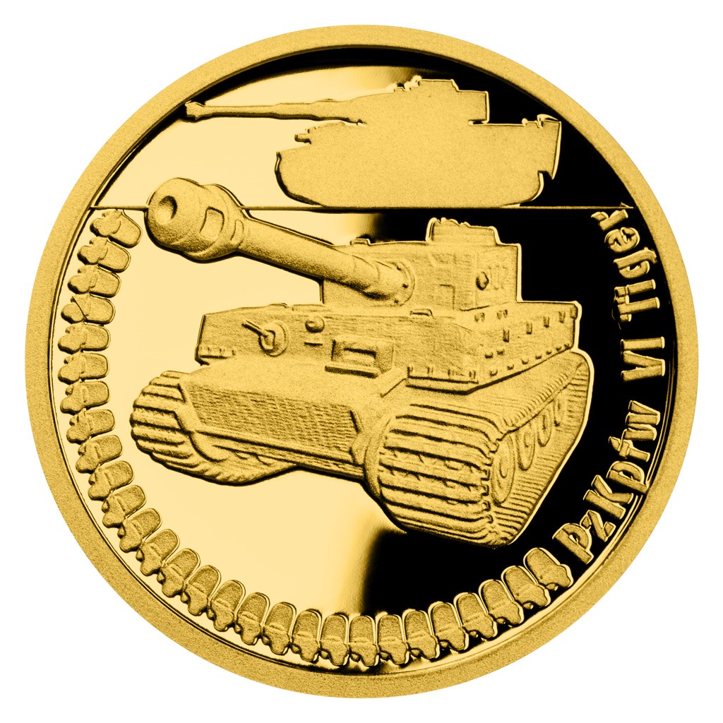 Čtvrtá zlatá mince České mincovny z cyklu Obrněná technika připomíná německý tank PzKpfw VI Tiger, který sloužil za druhé světové války.