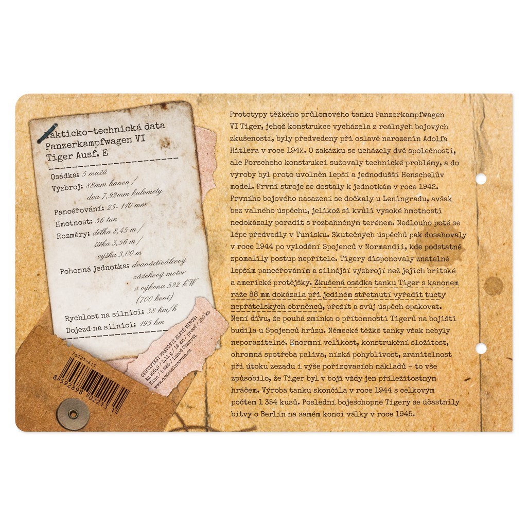 Mince je zasazena do výpravného balení v podobě katalogové karty plné dobových fotografií, zajímavostí a takticko-technických dat. Jednotlivé karty si můžete ukládat do sběratelského šanonu, který rovněž najdete v nabídce České mincovny.