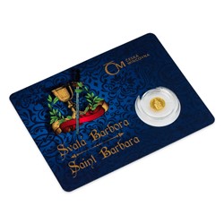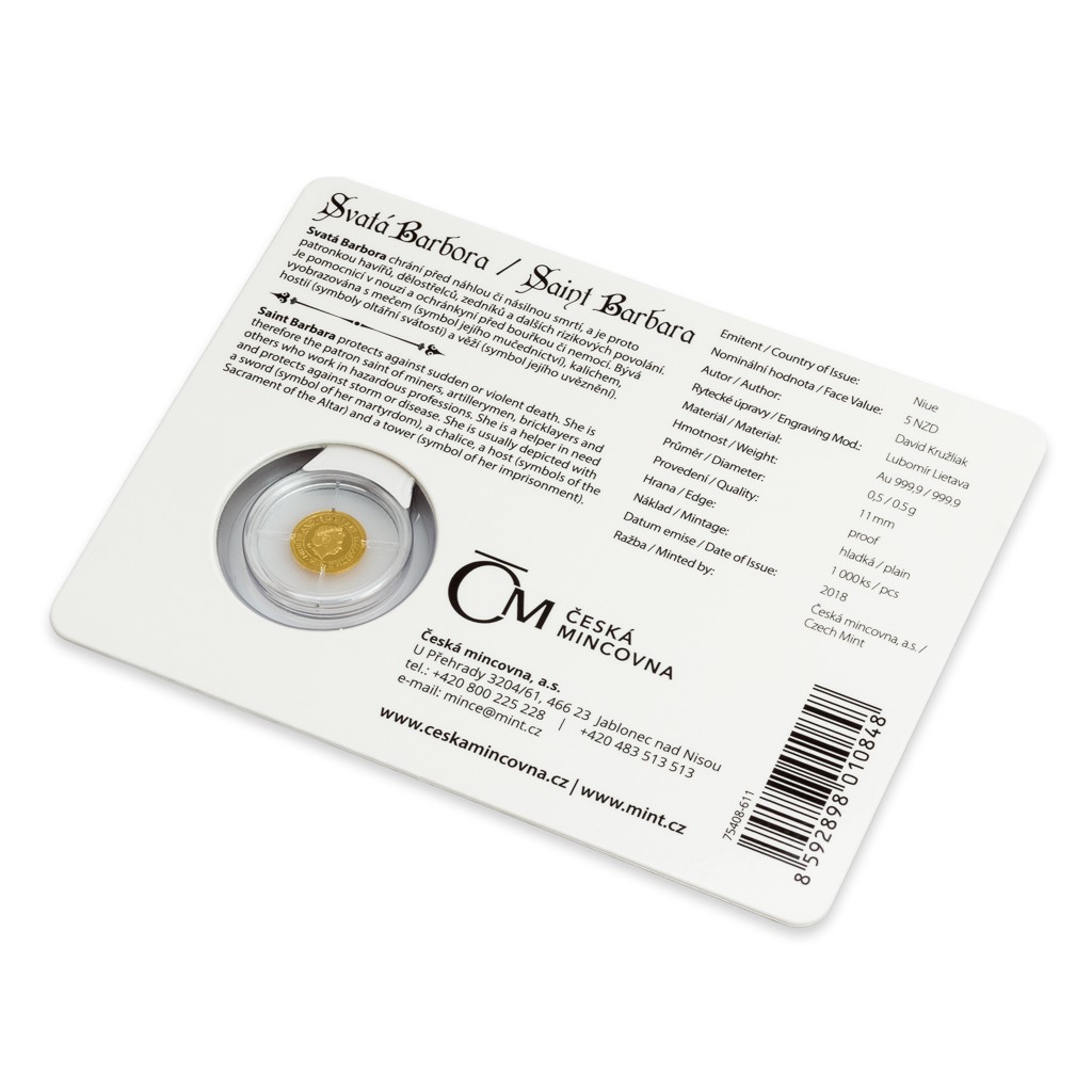 Atraktivní česko-anglické balení mince představuje svatou Barboru jako ochránkyni. Emise se vám stane talismanem pro štěstí, ale poslouží též jako dostupný zlatý dárek i originální přírůstek do numismatické sbírky.
