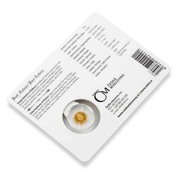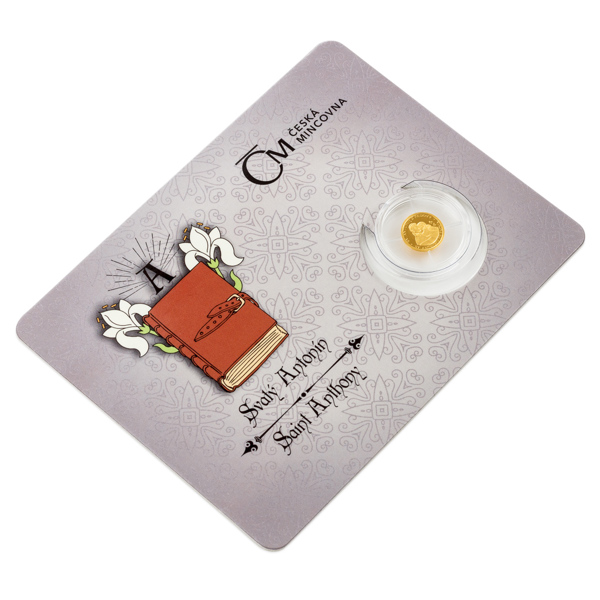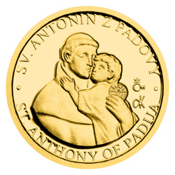 V historii najdeme přes dvě desítky svatých Antonínů. Tomu nejznámějšímu, kterým je svatý Antonín z Padovy, náleží další zlatá minimince České mincovny z cyklu Patroni.