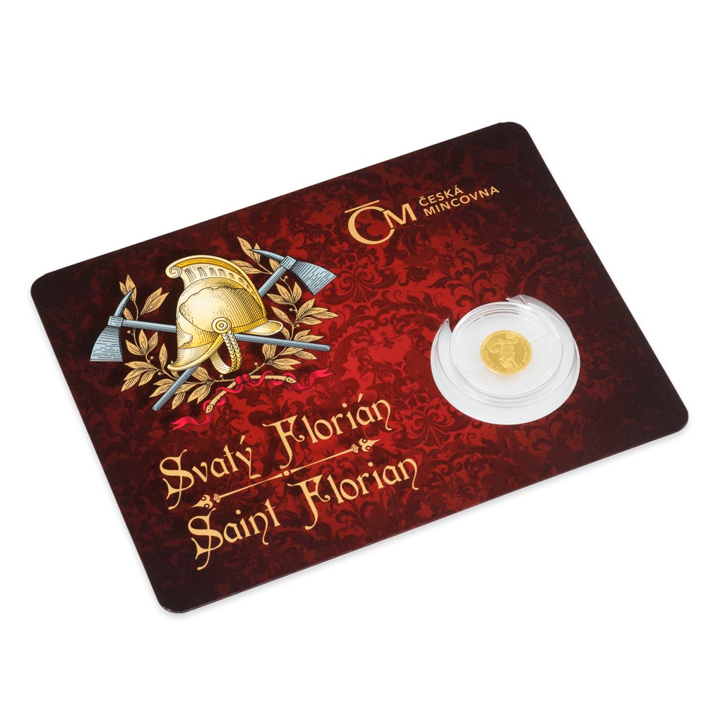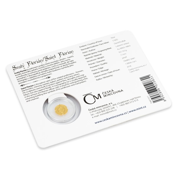 Zlaté mince jsou uložené do atraktivního dvojjazyčného balení, které představuje patrona coby ochránce. Poslouží jako talisman pro štěstí, dostupný dárek i originální přírůstek do sbírky.
