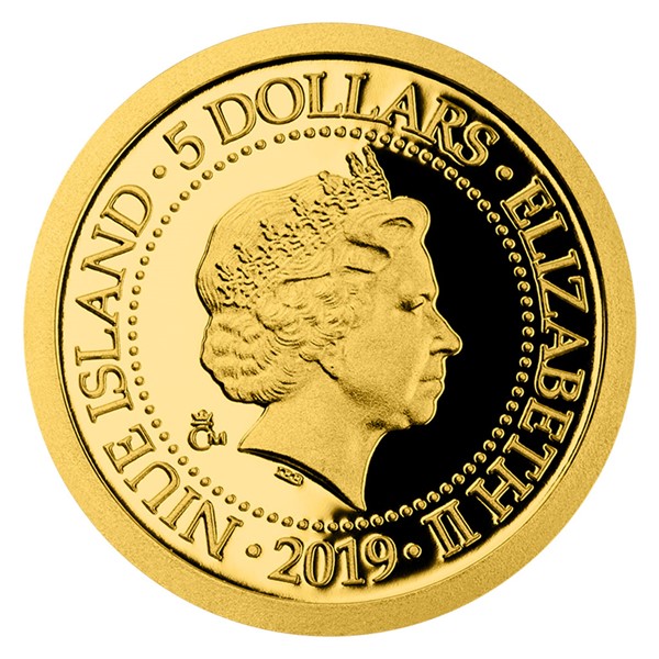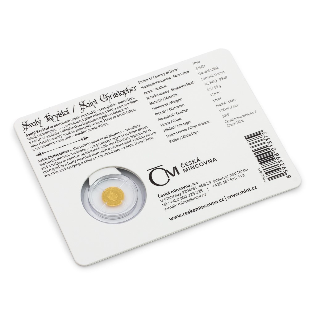 V souladu s křesťanskou legendou bývá svatý Kryštof vyobrazován jako statný vousatý muž s holí, který na ramenou nese dítě – malého Ježíše. Tuto podobu mu na reverzní straně mince přisoudil medailér David Kružliak. Výjev je obklopen česko-anglickým opisem SV. KRYŠTOF – ST. CHRISTOPHER. Averzní strana pak předkládá profil a jméno královny Alžběty II., rok emise 2019 a nominální hodnotu 5 DOLLARS (NZD) – čili atributy ostrova Niue, který České mincovně poskytuje zahraniční licenci k ražbě vlastních pamětních mincí.