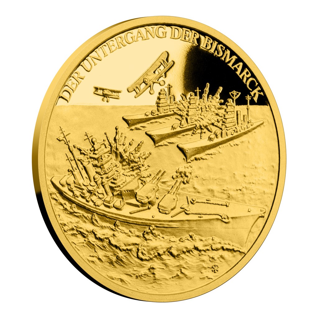Zpracování této i všech dalších mincí v sérii se ujal nadaný medailér Asamat Baltaev, DiS. Na reverzní straně vyobrazil poslední okamžiky válečné lodi Bismarck – pod palbou britských plavidel a za neúnavných útoků letounů RAF. Válečný výjev doplnil nápisem DER UNTERGANG DER BISMARCK, tedy ZKÁZA BISMARCKU. Averzní strana je věnována nezbytným atributům emitenta, nominálu 5 DOLLARS a roku vydání mince 2016.
