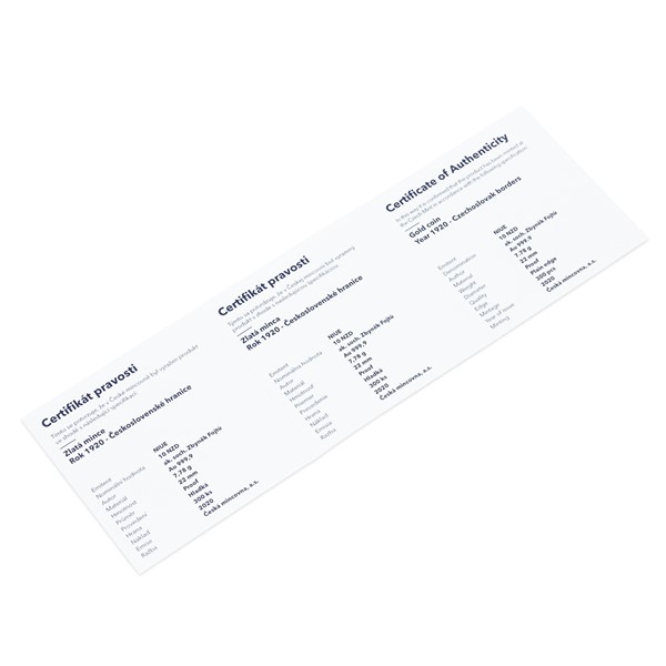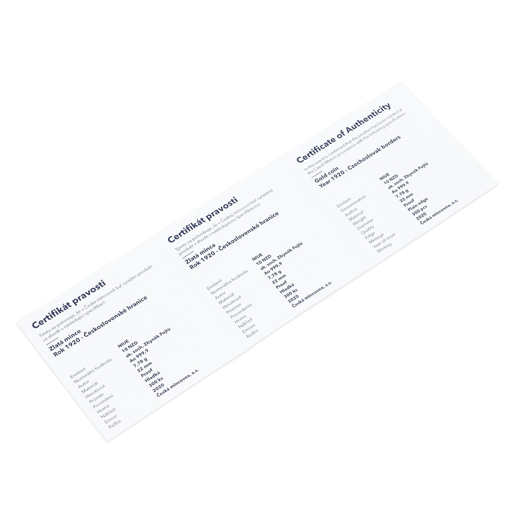 Zlatá mince Rok 1920 - Československé hranice proof