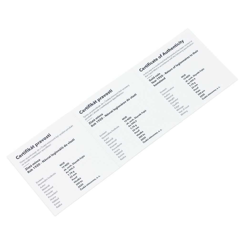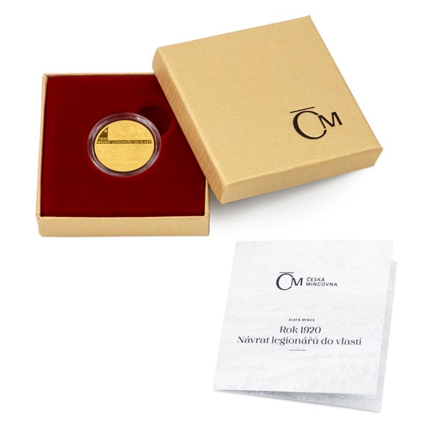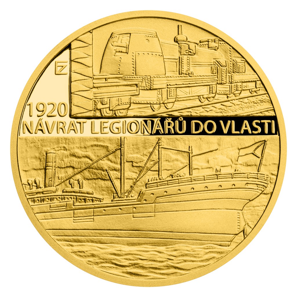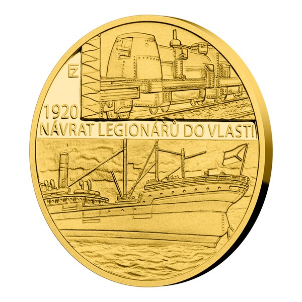 Čtvrtá a poslední zlatá mince České mincovny z minisérie Rok 1920, která pojednává o budování československé státnosti, připomíná návrat legionářů do vlasti.
