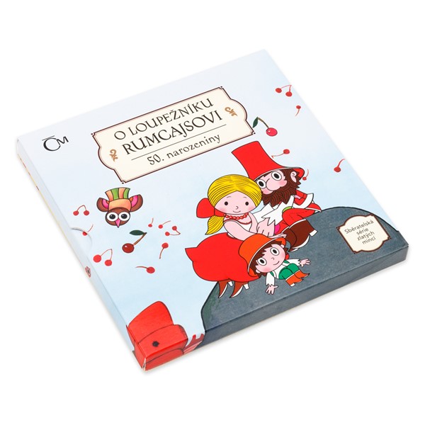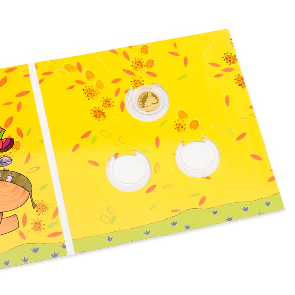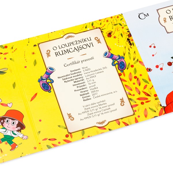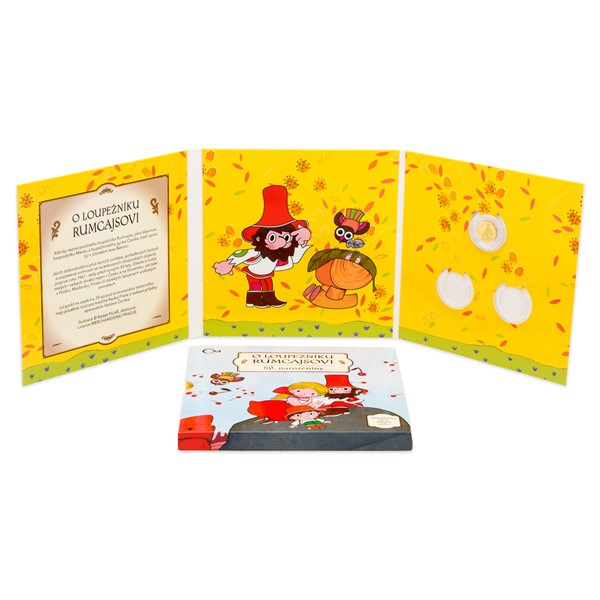 Rumcajsova mince je uložena do pohádkového alba, které pojme ještě další dvě zlaté ražby věnované Mance a Cipískovi.