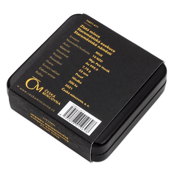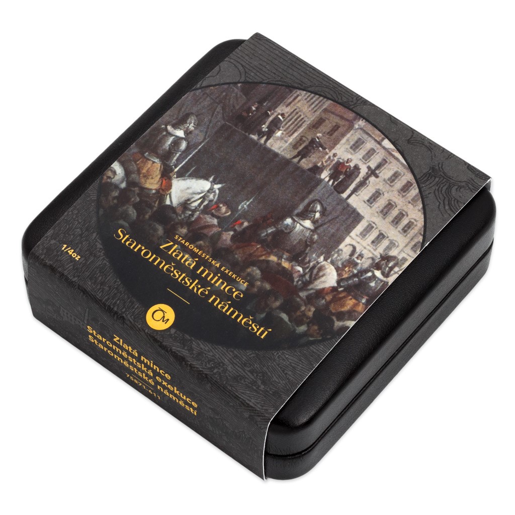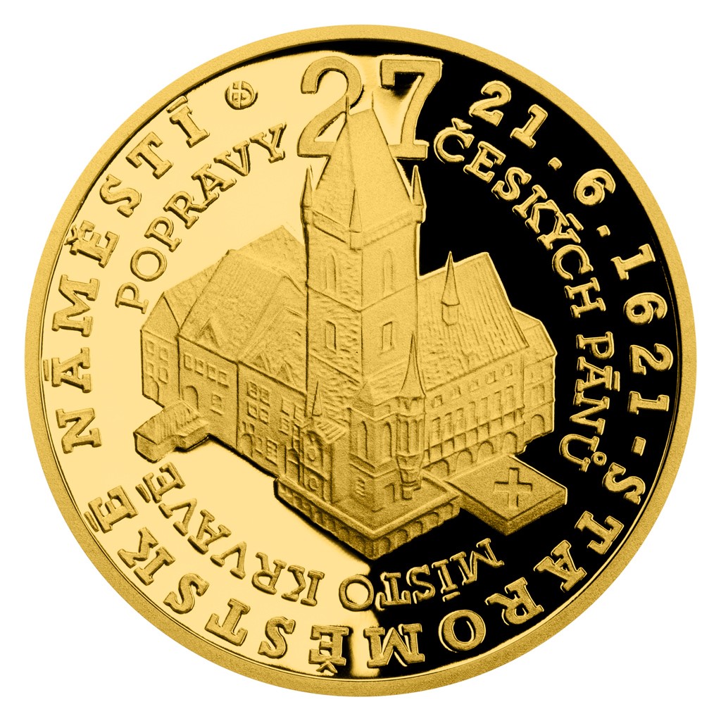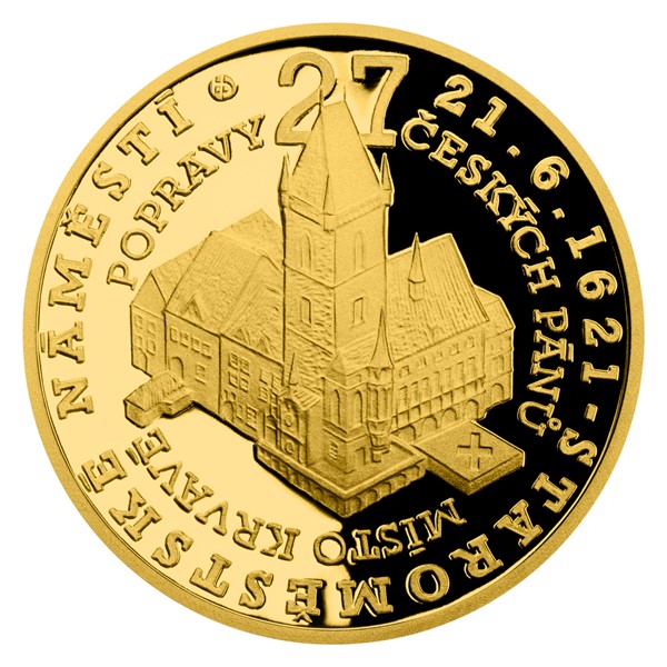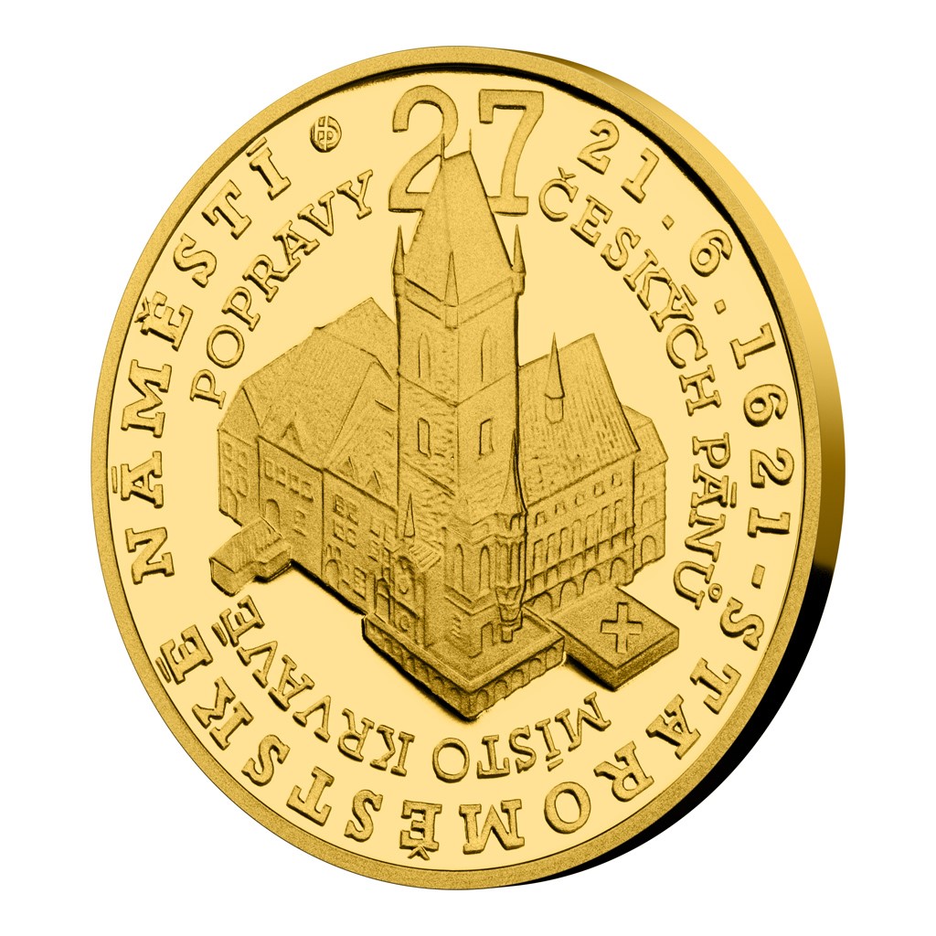 Druhá zlatá mince České mincovny z minisérie, která vychází u příležitosti 400. výročí popravy 27 českých pánů, připomíná místo konání krutého divadla – totiž pražské Staroměstské náměstí.