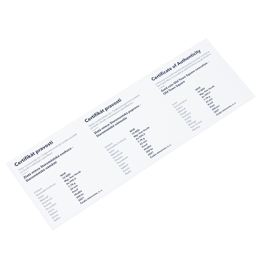 Právě staroměstský chodník se sedmadvaceti křížky najdete na averzní straně mince, která je dílem Mgr. Petra Horáka. Reverzní strana pak předkládá detailní izometrický pohled na Staroměstskou radnici s orlojem a popravčím pódiem. Bohatý opis, který obklopuje stavbu, uvádí STAROMĚSTSKÉ NÁMĚSTÍ – MÍSTO KRVAVÉ POPRAVY 27 ČESKÝCH PÁNŮ – 21. 6. 1621. Protože mince České mincovny vycházejí v zahraniční licenci ostrova Niue, nesou na averzní straně ještě jeho státní znak, nominální hodnotu 10 DOLLARS (NZD) a letopočet emise 2021.
