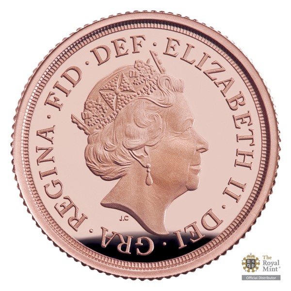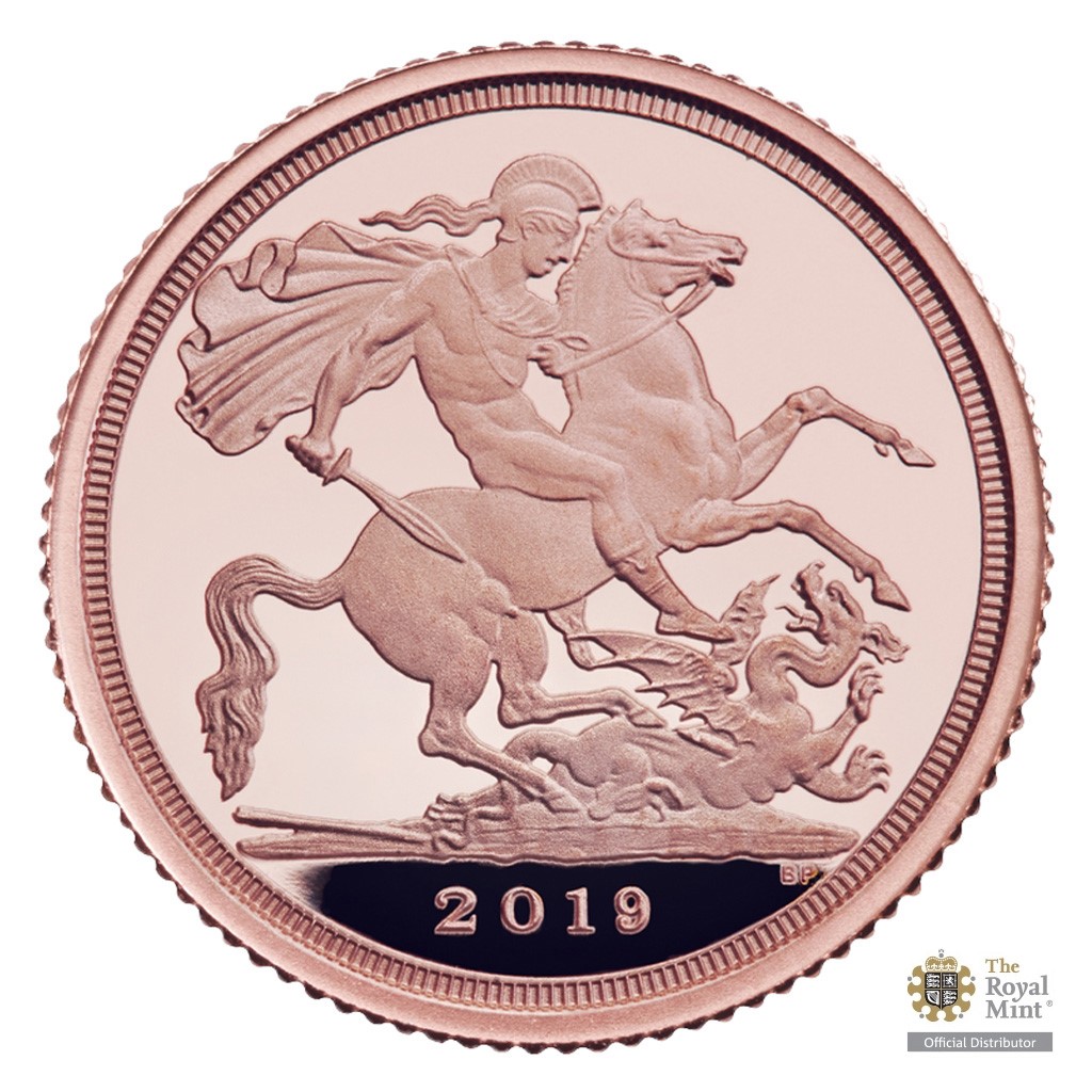 Averzní strana mince vyražené ze zlata o tradiční ryzosti 22 karátů nese portrét a jméno královny Alžbety II. obklopený latinským opisem „ELIZABETH II DEI GRA REGINA FID DEF“ (Alžběta II., z Boží milosti královna, ochránkyně víry). Velkolepá scéna souboje světce s mytickým tvorem na reverzní straně mince je dílem Benedetta Pistrucciho, které vzniklo před dvěma stoletími. Kompozici reverzu uzavírá letopočet vydání mince 2019.